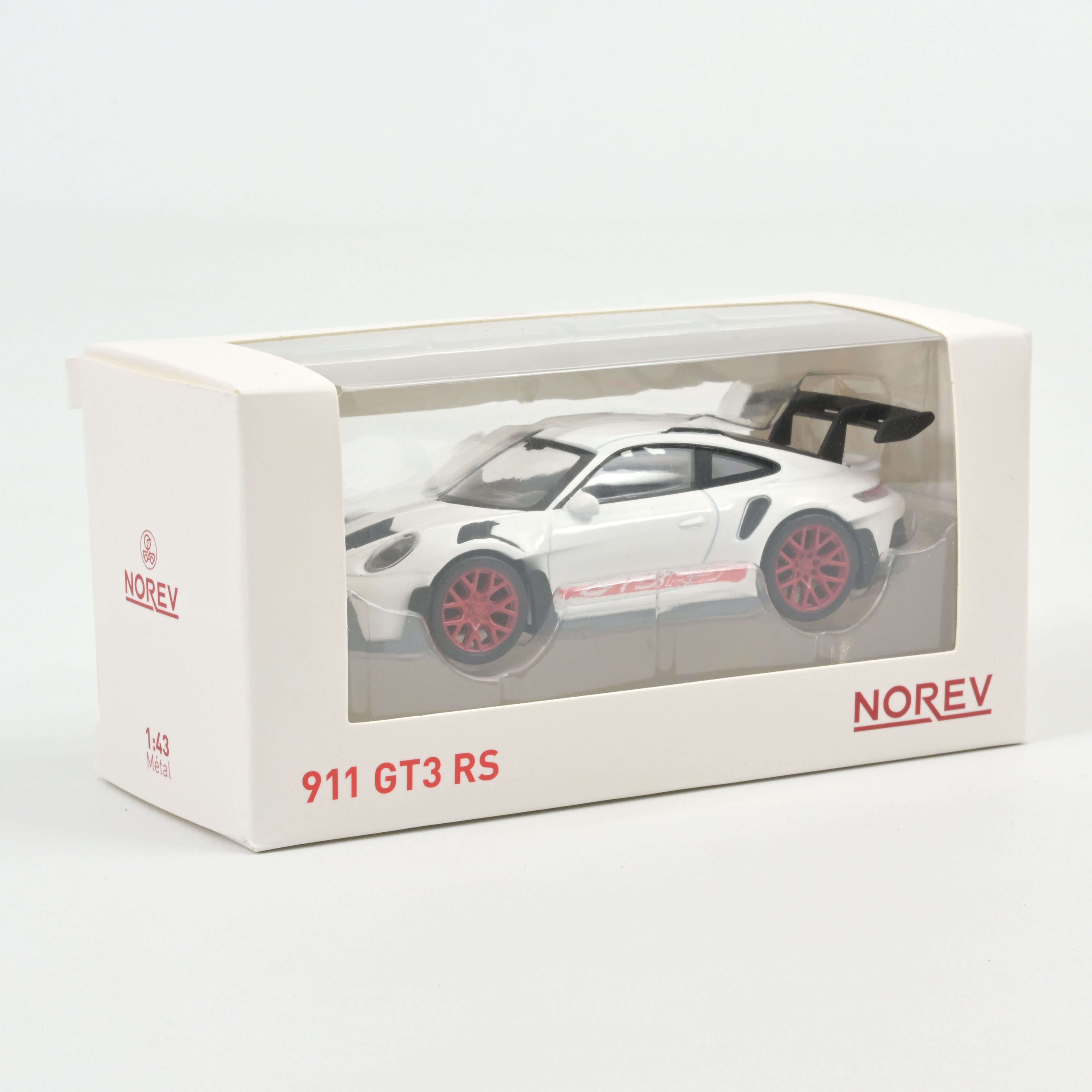 Our model faithfully reproduces this white coupé with its distinctive red markings. Featuring its impressive rear spoiler, the replica perfectly embodies the sporty spirit and intense performance of the 2022 Porsche 911 GT3 RS.