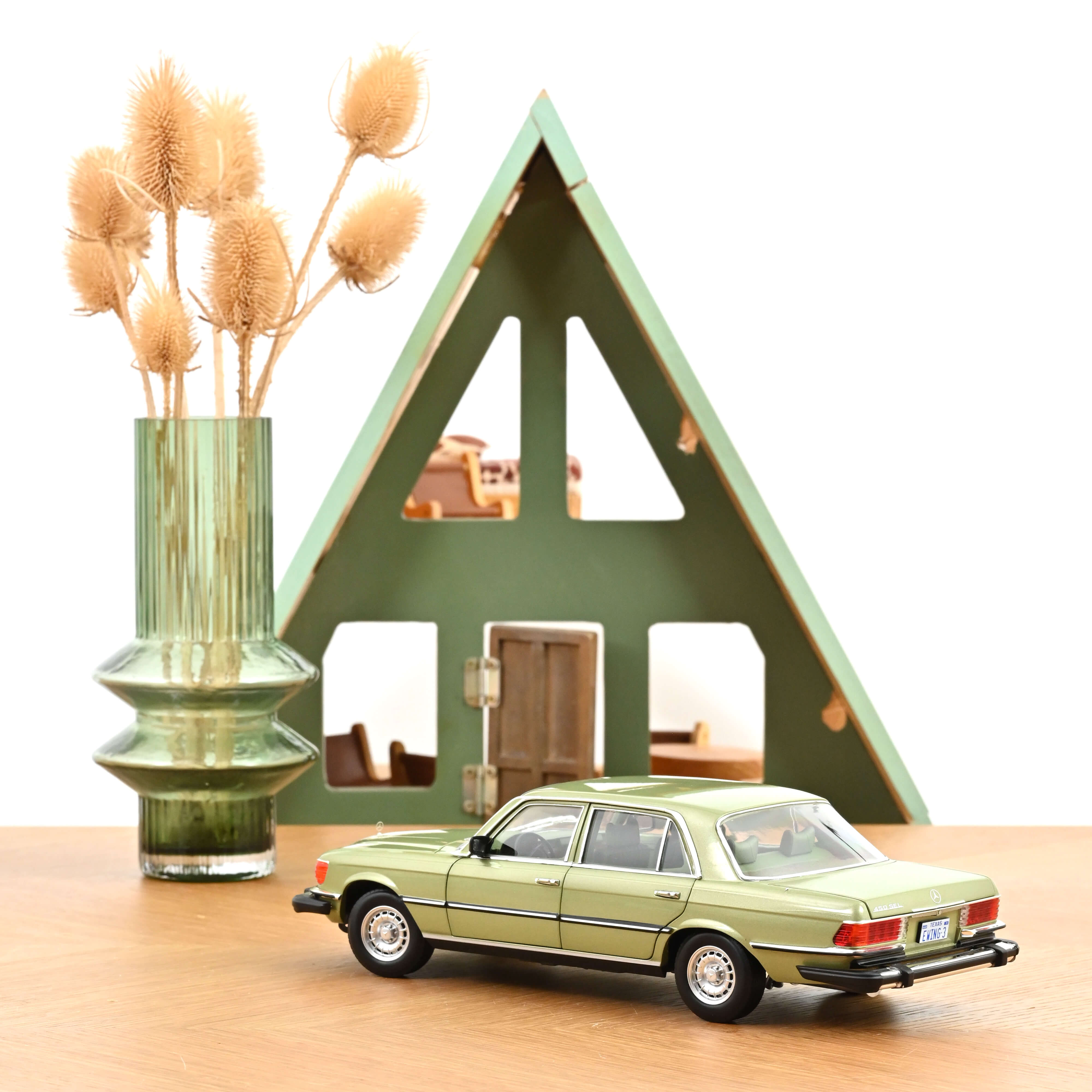 Our model represents the S-Class that oil tycoon J.R. Ewing used as his vehicle in the third season of the extremely popular and successful TV series ‘Dallas’. In addition to the typical US bumpers and headlights, the silver-green model is also adorned with the correct licence plate.