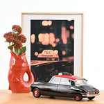 The Citroën DS 19 became popular among taxi drivers due to its reliability and spacious interior. This miniature features a black body with a red roof and two-tone wheels. On the roof, the "TAXI" light system indicates the vehicle’s availability. A decal sheet is included, representing the coat of arms of a renowned Parisian taxi company.