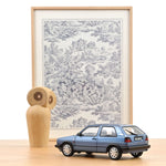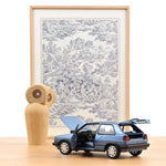 A new colour was specially mixed for the original - ‘Starblue’. Our model naturally also shines in this colour - and also bears the distinctive stickers and rims that made the real Golf a champion.