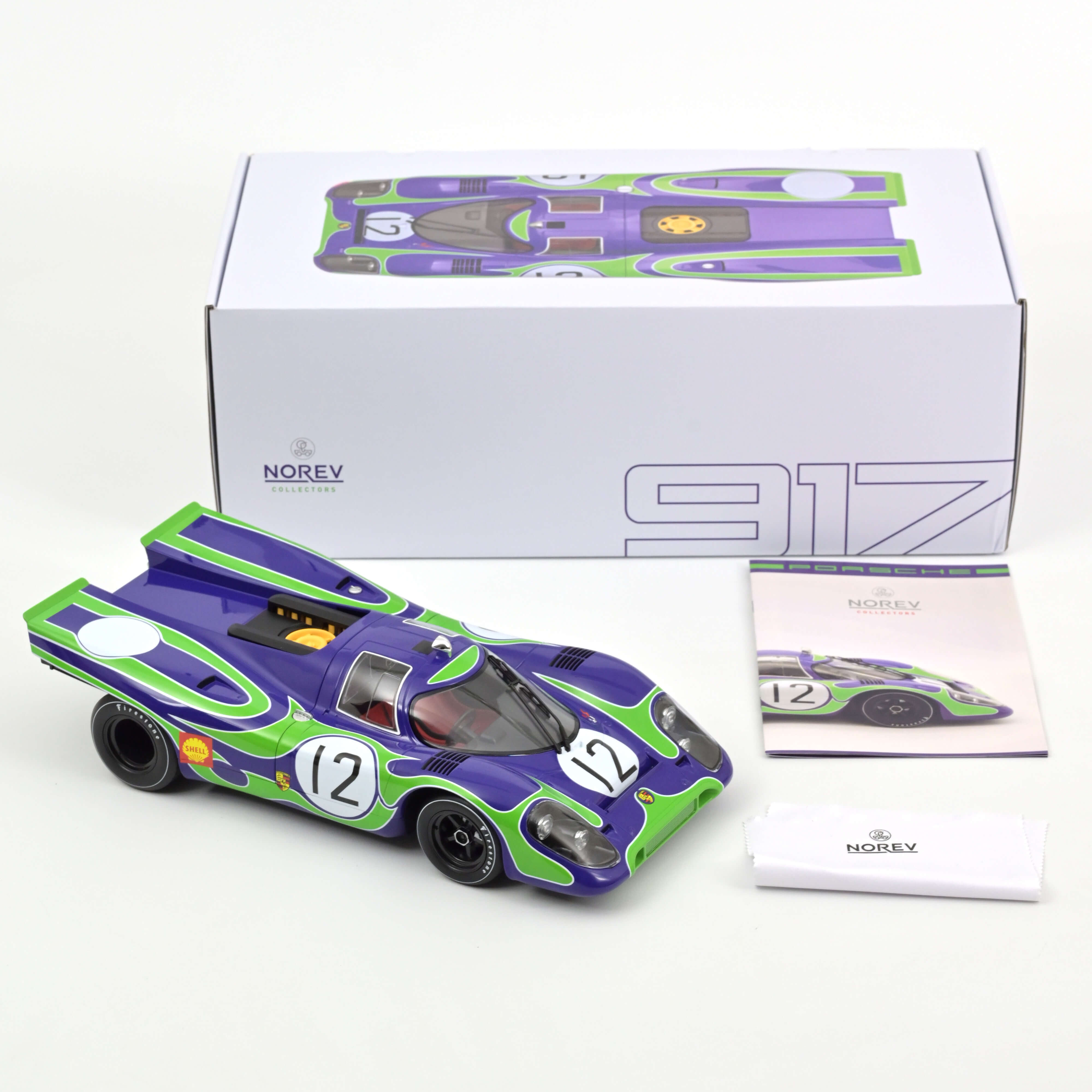 La Porsche 917K reproduite par Norev (numéro de châssis #917-021) portait, lors de la course intersérie sur le circuit d’Hockenheim en 1970, une peinture inspirée de la fameuse 917 «Hippie» (numéro de châssis #917-042) qui avait participé aux 24h du Mans et s’était classée deuxième au classement général.