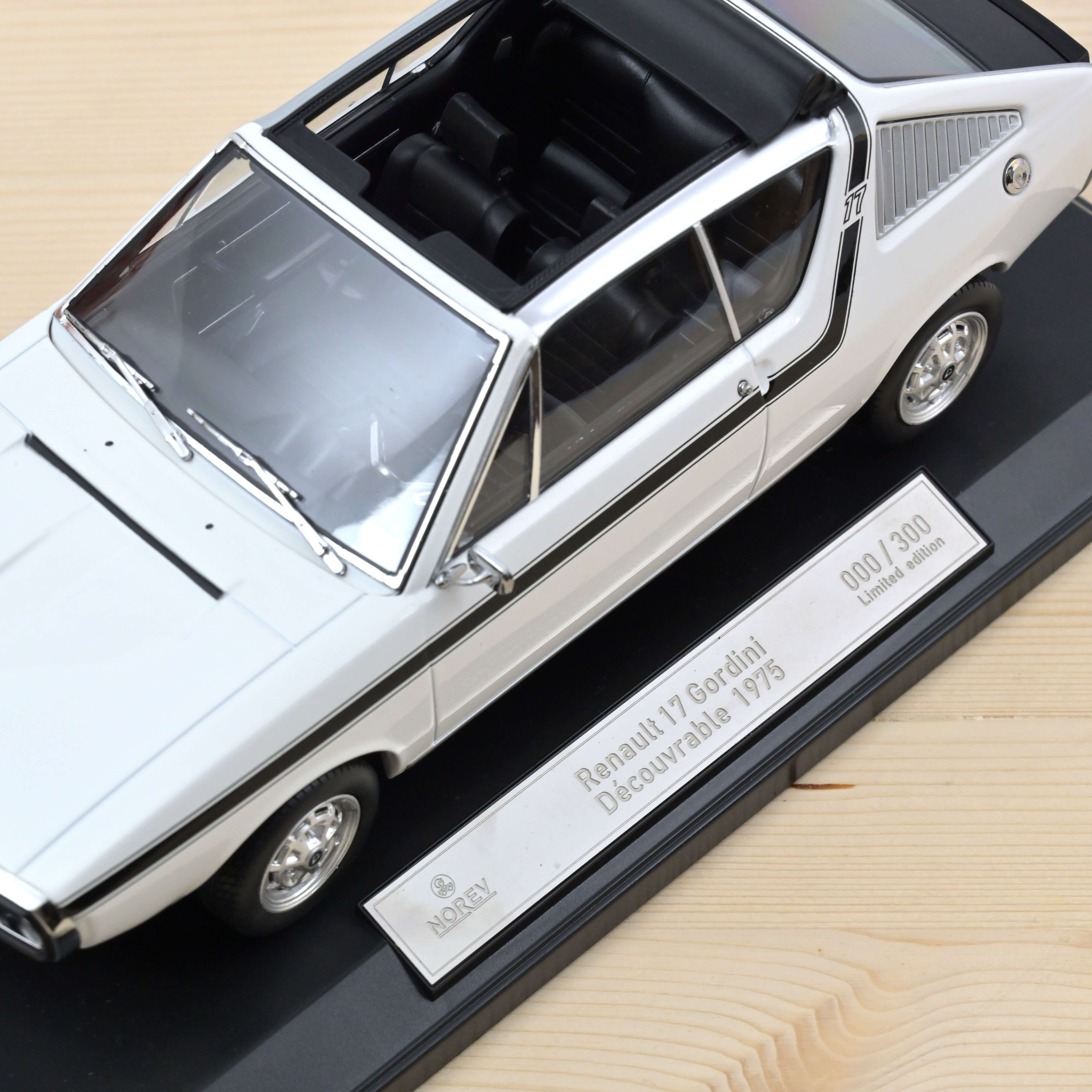 Cette version de Renault 17 découvrable possède une teinte blanche mais également une décoration noire proposée à l’époque par Renault en accessoire. Avec son intérieur type cuir noir, voici une miniature tout en contraste noir et blanc.