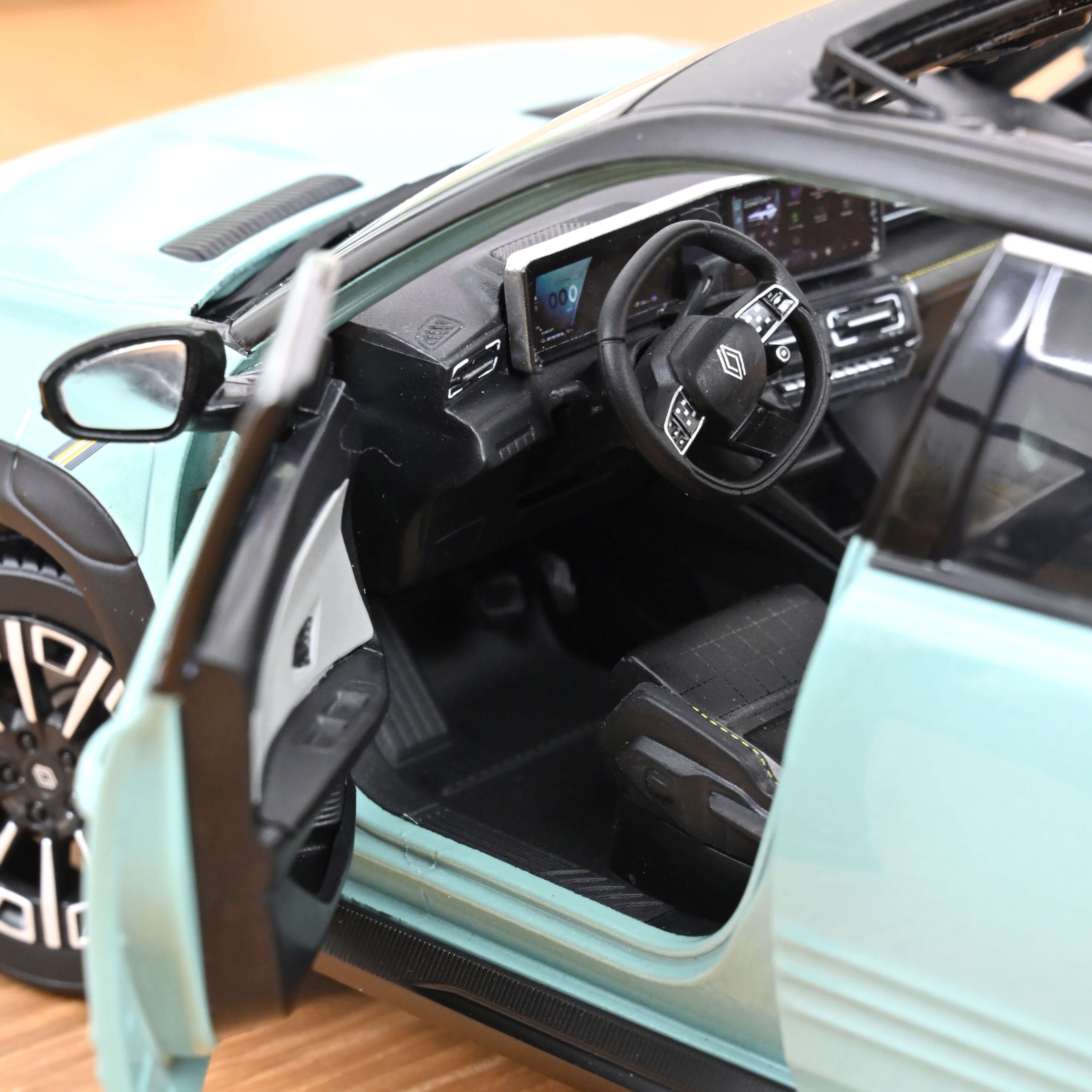 Avec la nouvelle Renault 4 E-Tech, Renault propose un SUV compact 100 % électrique, se positionnant comme une alternative plus polyvalente à la Renault 5 E-Tech. Hérités de la légendaire Renault 4, certains détails incontournables sont actualisés : la calandre, les feux arrière... Norev a apporté un soin particulier pour retranscrire ces clins d’œil du passé présents sur la voiture allant jusqu’à représenter la sérigraphie spécifique des custodes où une ancienne et une nouvelle R4 se font la course. La miniature en finition Iconic avec toit ouvrant « plein sud » permet d’observer l’intérieur, dont la sellerie textile 100 % recyclée pied-de-poule gris avec ruban jaune. La miniature est fournie avec un outil pour faciliter l’ouverture des portes, orné du logo Norev.