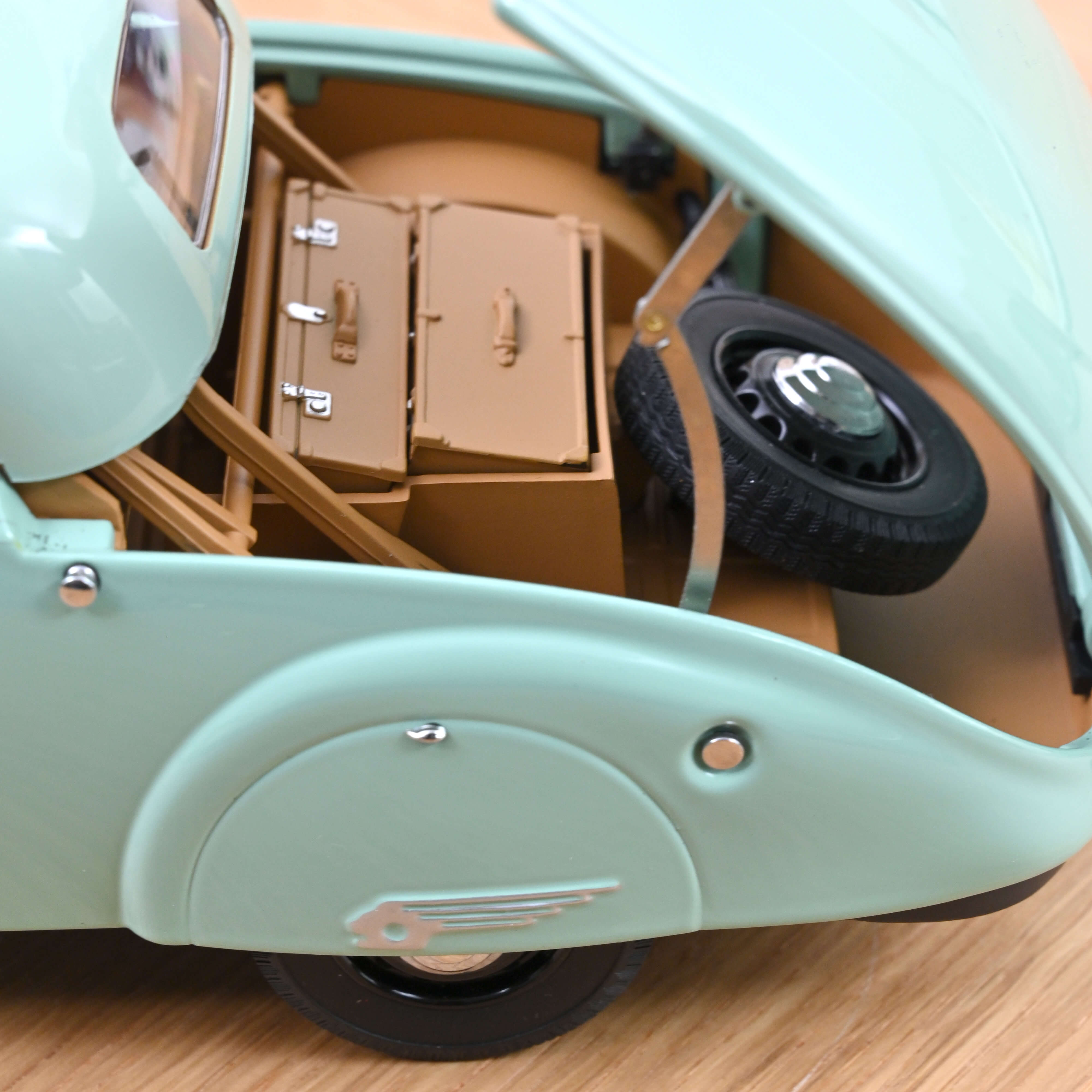 Norev propose une édition spéciale de la Peugeot 402 Éclipse miniature en vert d’eau, rehaussée d’un fin filet plus sombre pour une touche d’élégance. L’intérieur beige, assorti aux petites valises du coffre, rappelle le luxe de cette voiture d'époque.