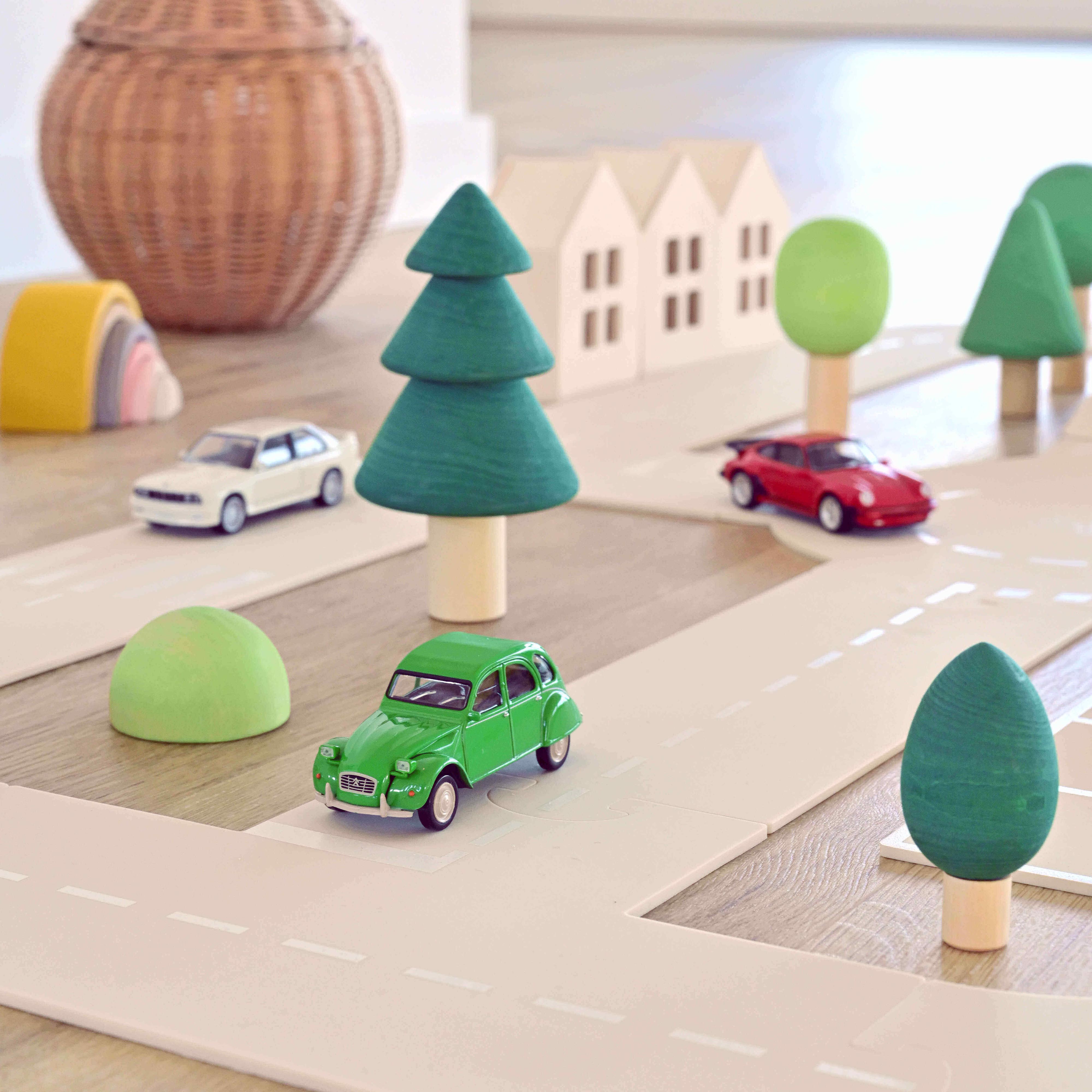 Notre circuit de ville pour petites voitures est composé de 15 pièces souples en silicone, à assembler facilement comme un puzzle (rond-point et parking, plus de 4 mètres de route).