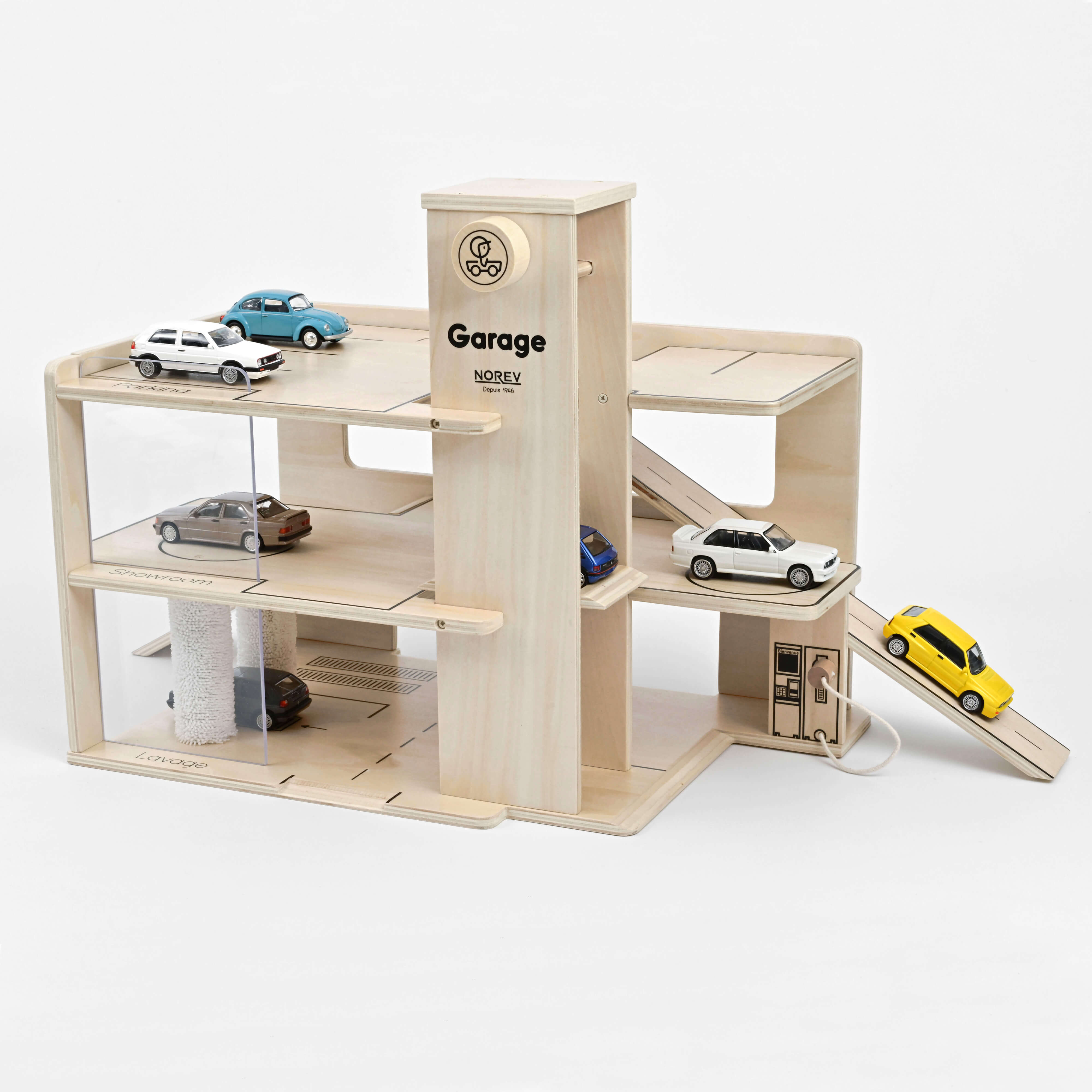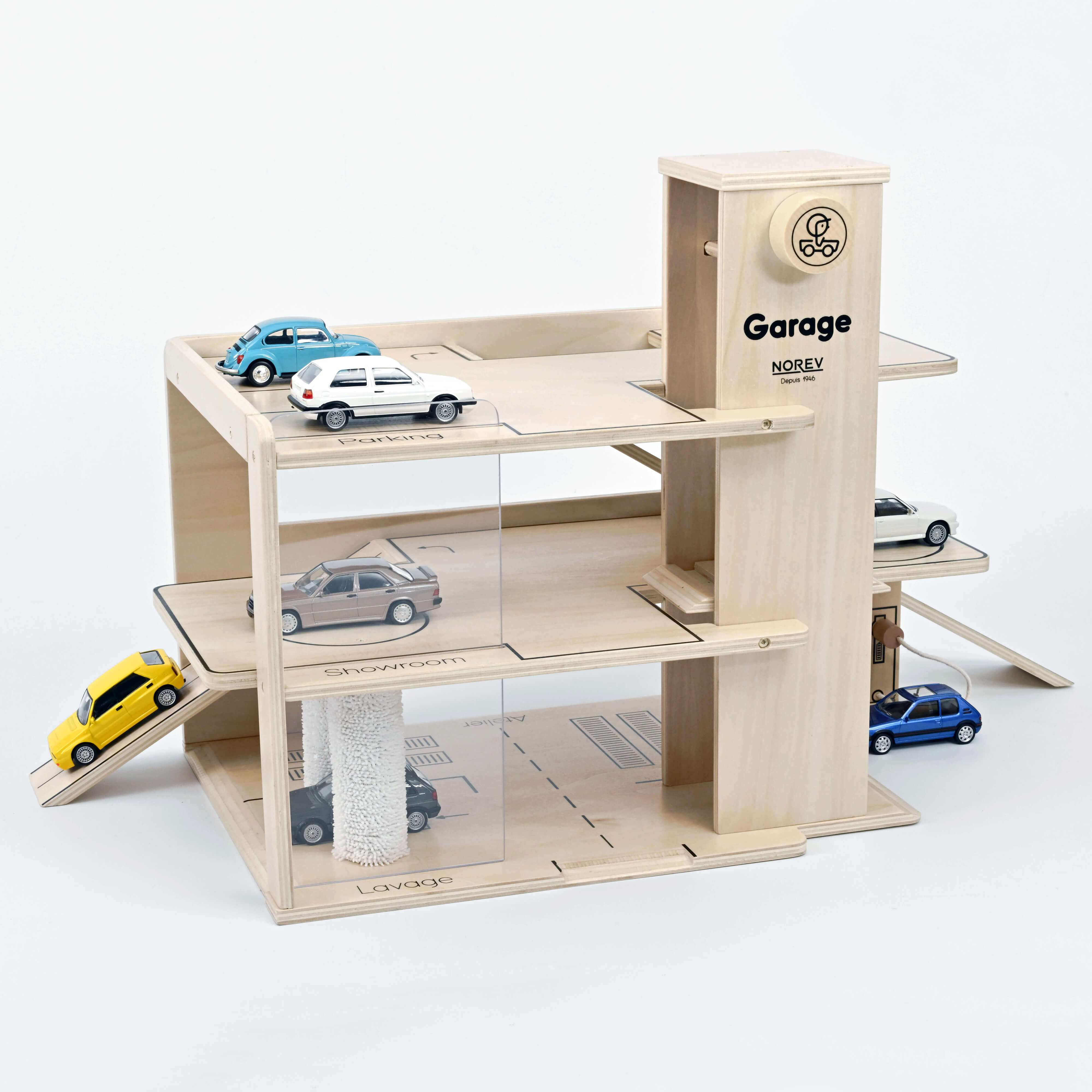 Notre garage en bois pour enfant allie jouabilité et design contemporain. Son style sobre et épuré ravira les parents et ses 3 niveaux de jeu stimuleront l'imaginaire des enfants : ascenseur avec manivelle, station de lavage, showroom, parking, rampe de descente et pompe à essence pour faire le plein avant de partir vers de nouvelles aventures !