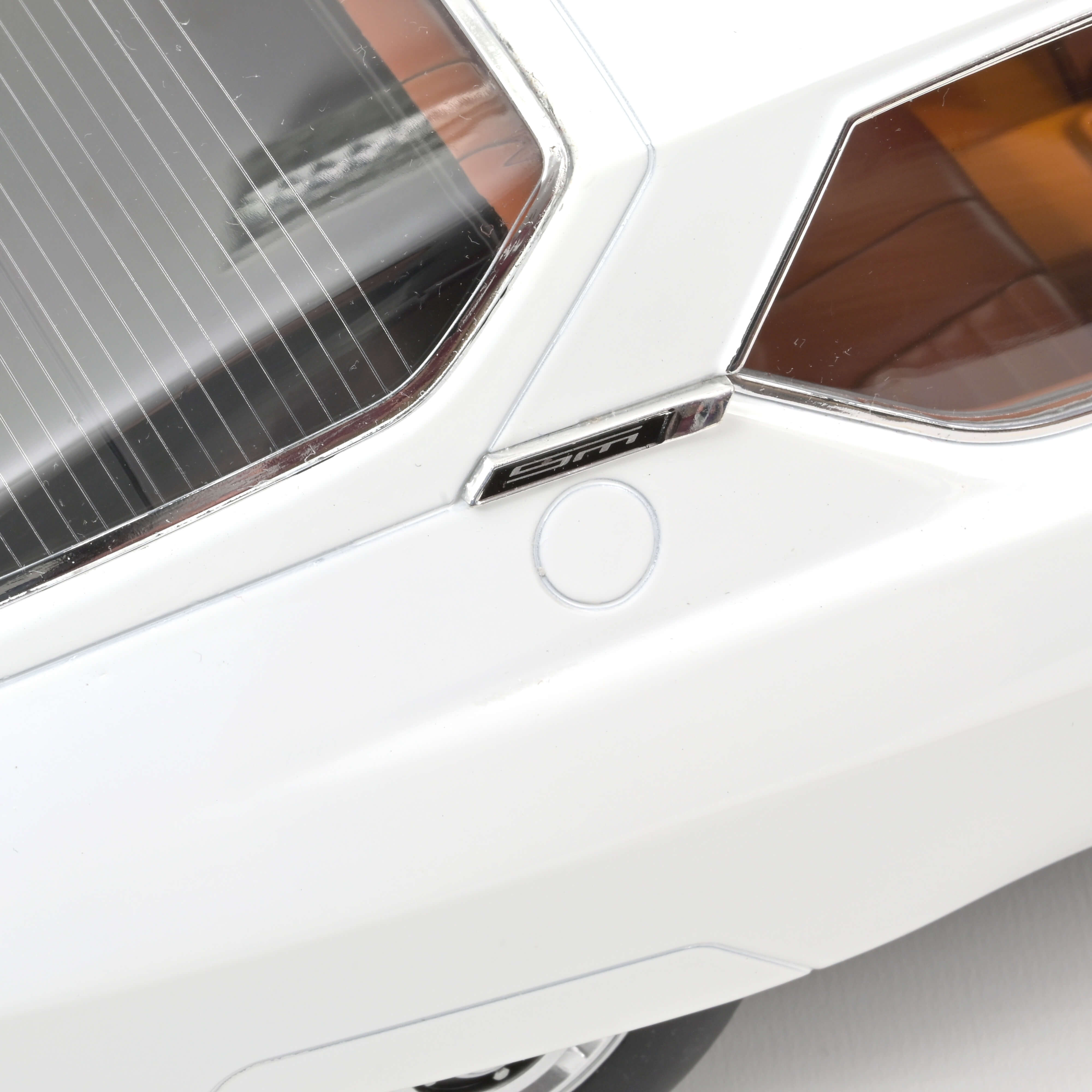 Une voiture à la robe blanche et à un intérieur cuir marron y est présentée sur une estrade circulaire dans un décor pop crème et beige.