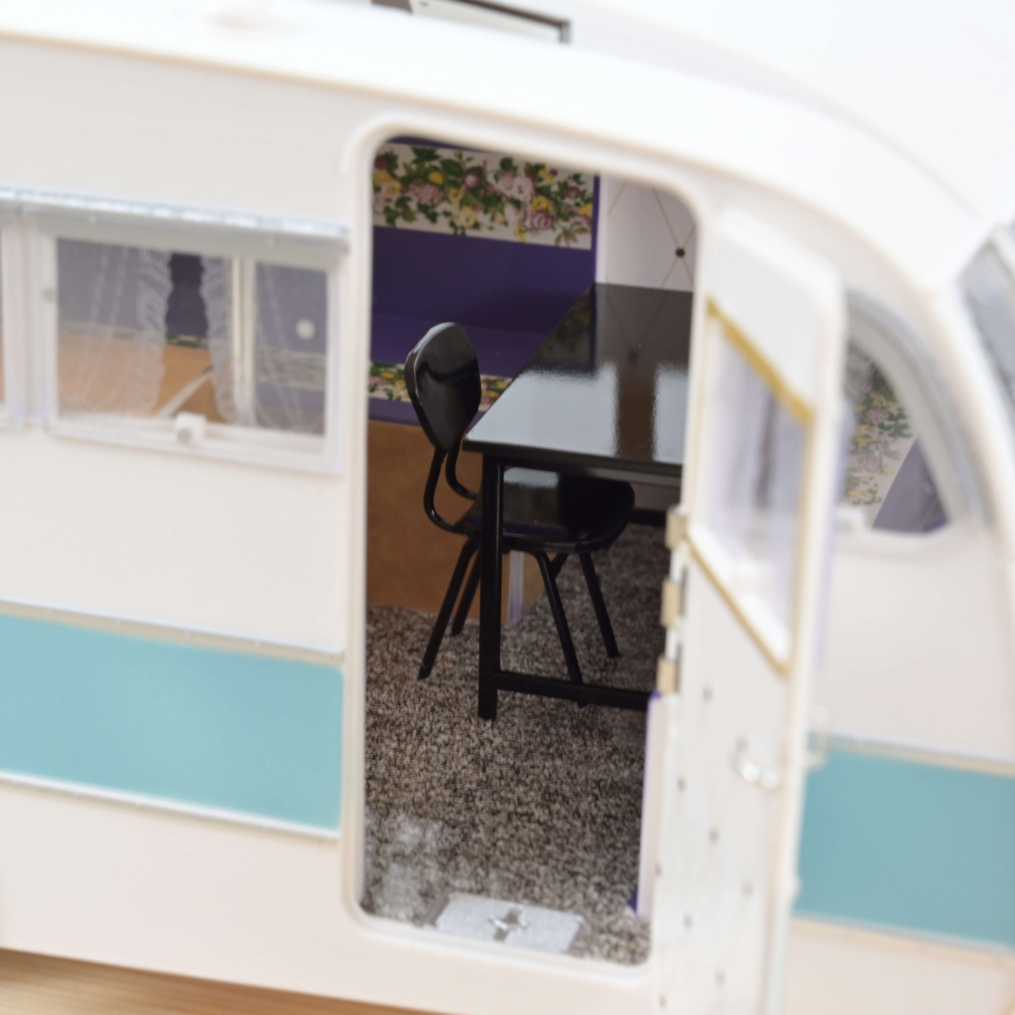 - le mobilier de cuisine de la caravane est coordonné avec l’intérieur bleu de la DS 19