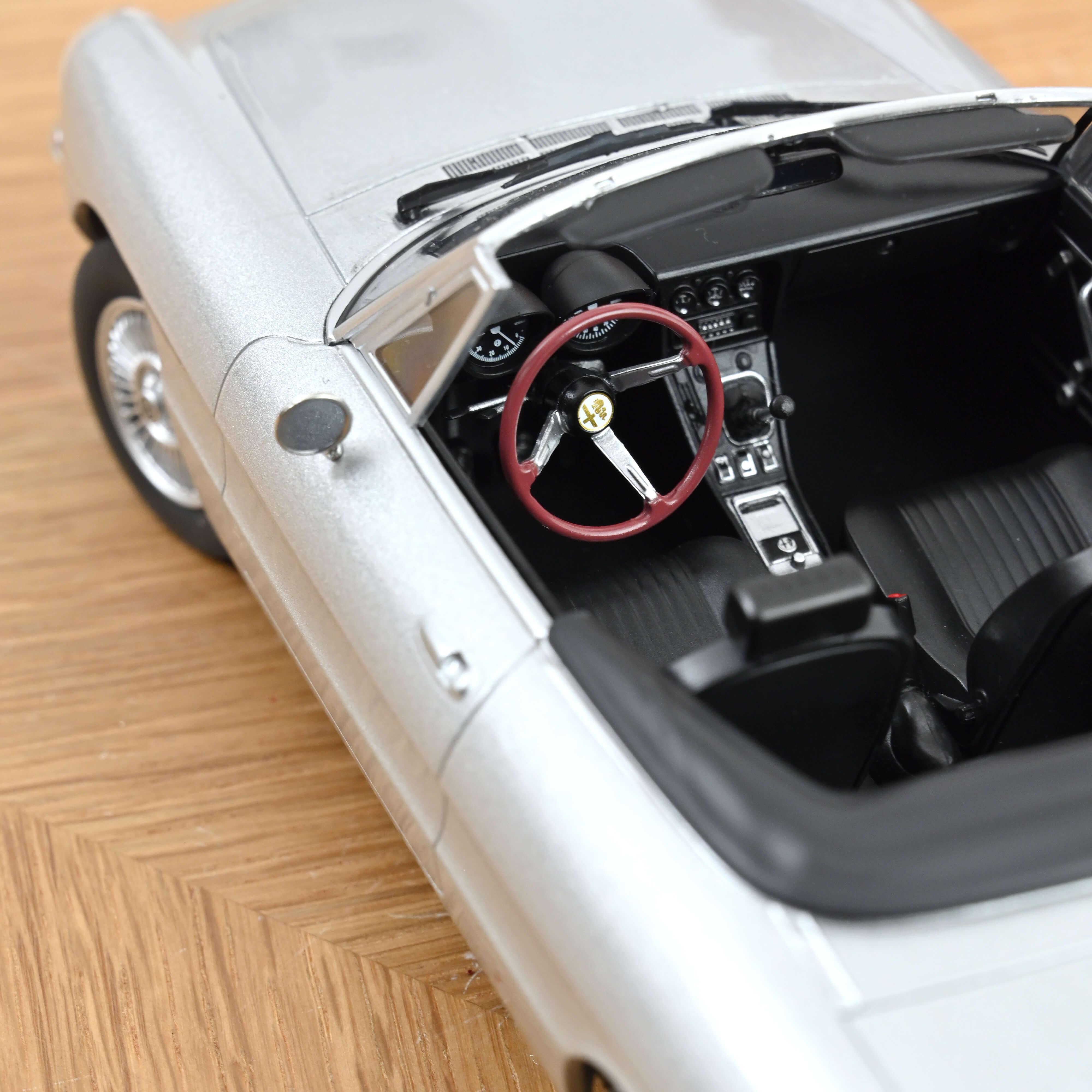 Les lignes magnifiques de l'Alfa Norev sont soulignées par la combinaison classique des couleurs de la peinture Gris clair mét ( AR 737 ) et de l'intérieur noir sportif. Des jantes contemporaines en alliage léger rehaussent encore l'allure de la miniature.
