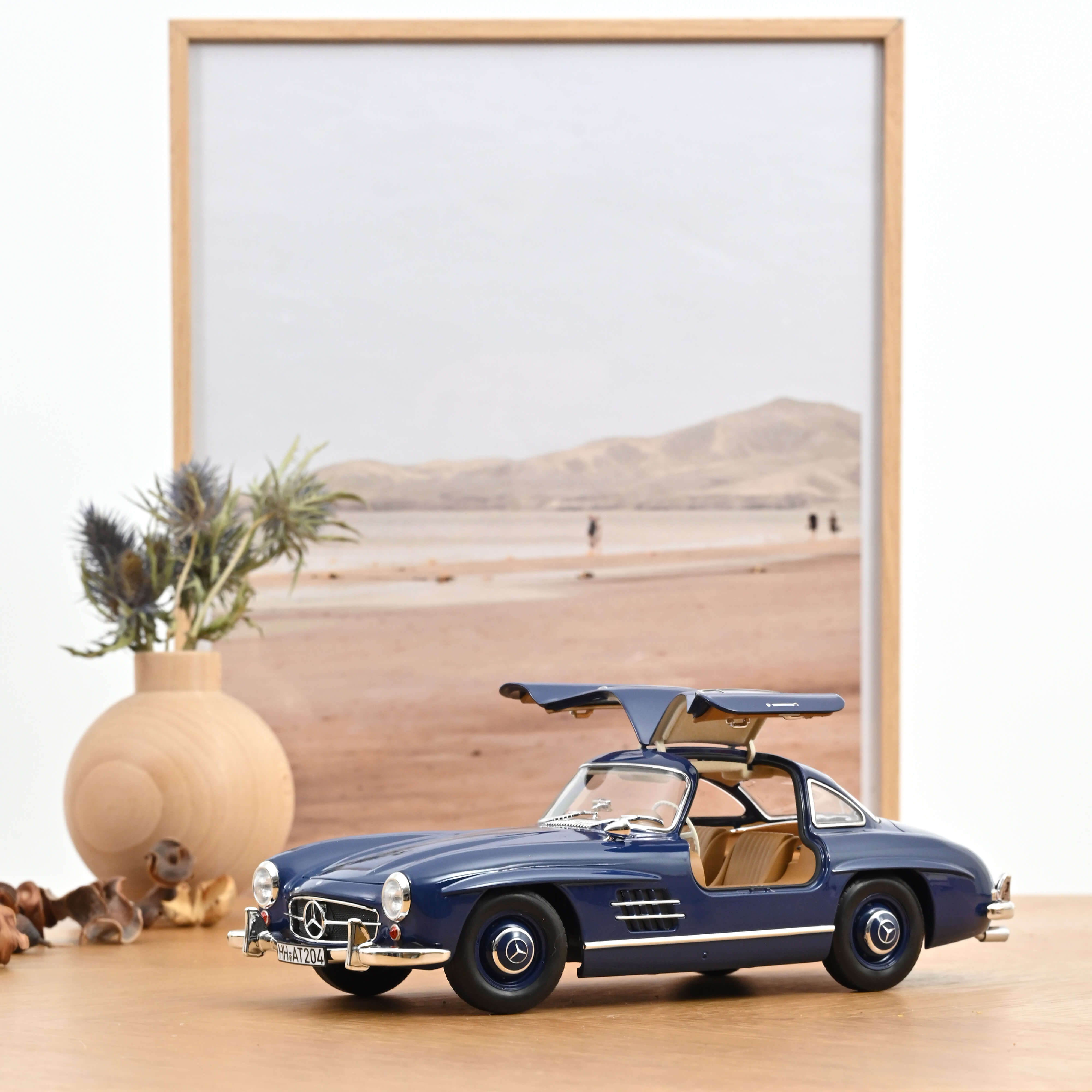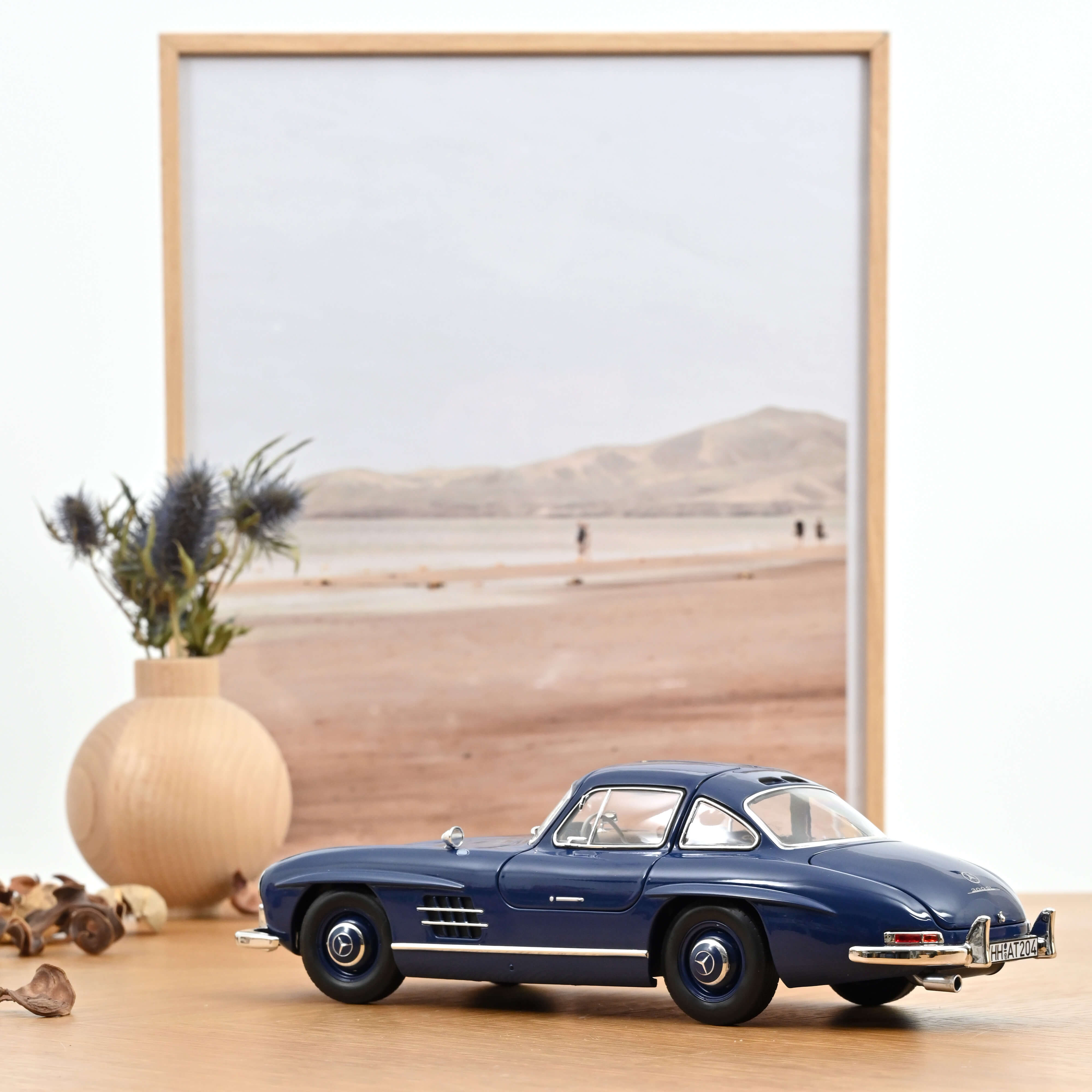 Pour cette reproduction, nous avons retenu une superbe teinte bleue, particulièrement rare sur la 300 SL. Parmi les quelque 1 400 coupés produits, seuls quatre exemplaires auraient reçu cette couleur, faisant de cette configuration l’une des plus exclusives. Associée à un intérieur beige, elle confère au modèle une élégance intemporelle, parfaitement mise en valeur dans cette miniature au 1/18.