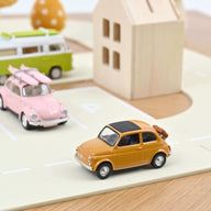 Notre modèle jouet, peint en Jaune Positano, couleur emblématique de l'époque, est agrémenté d'un bagage reproduit sur le porte-bagages arrière.