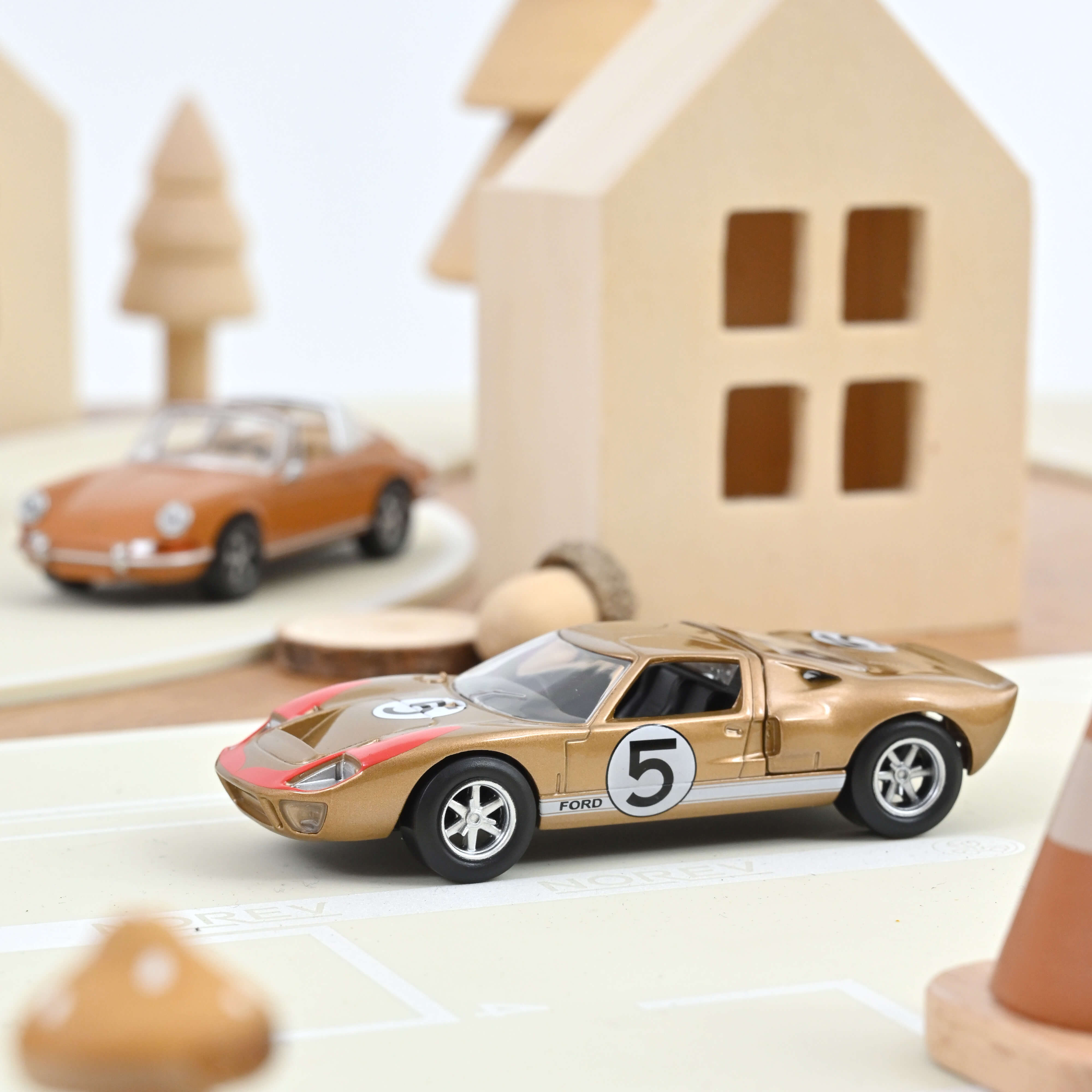 Notre jouet reproduit la Ford GT40 dorée avec son numéro 5 emblématique. Le capot arrière ouvrant ajoute une touche de réalisme et de jouabilité