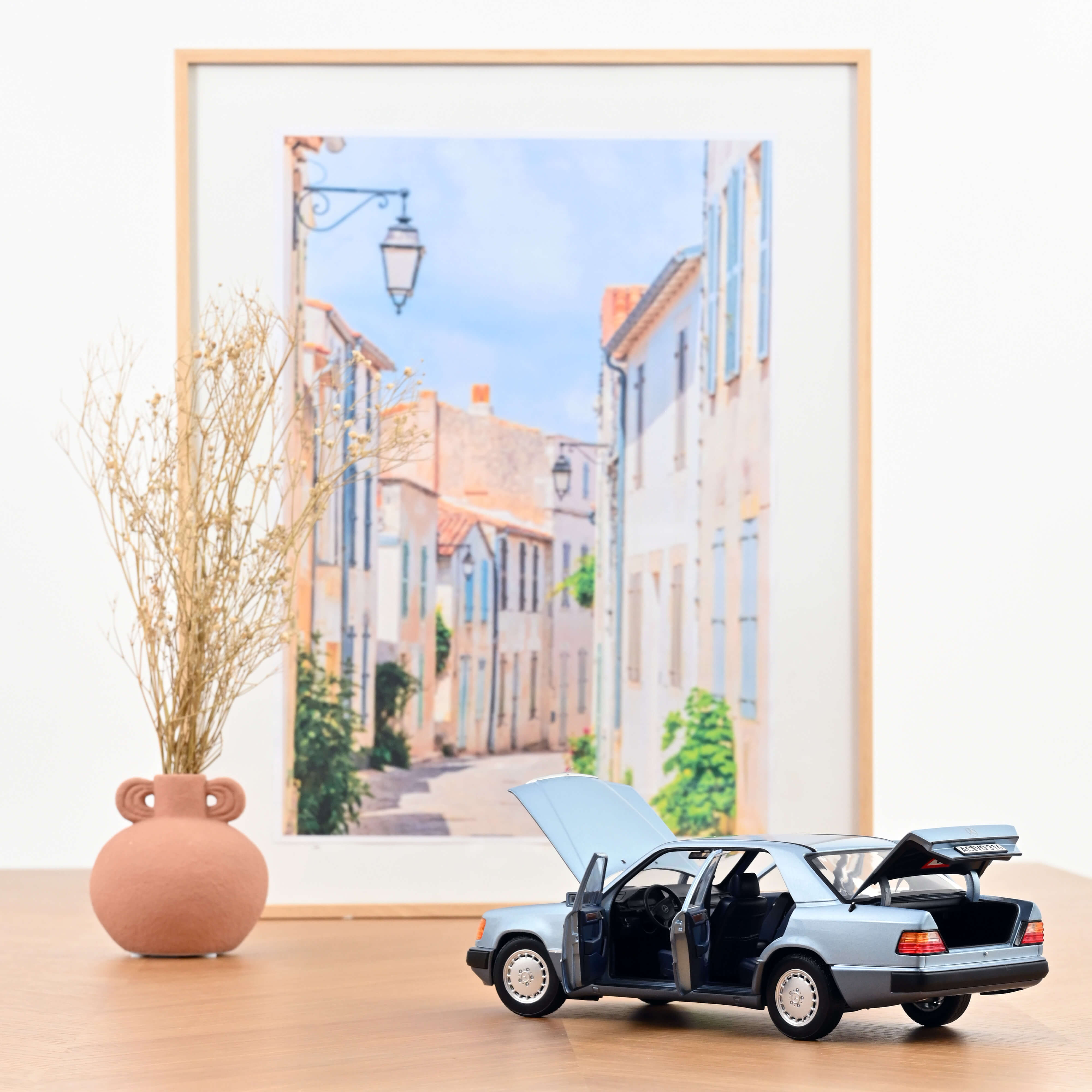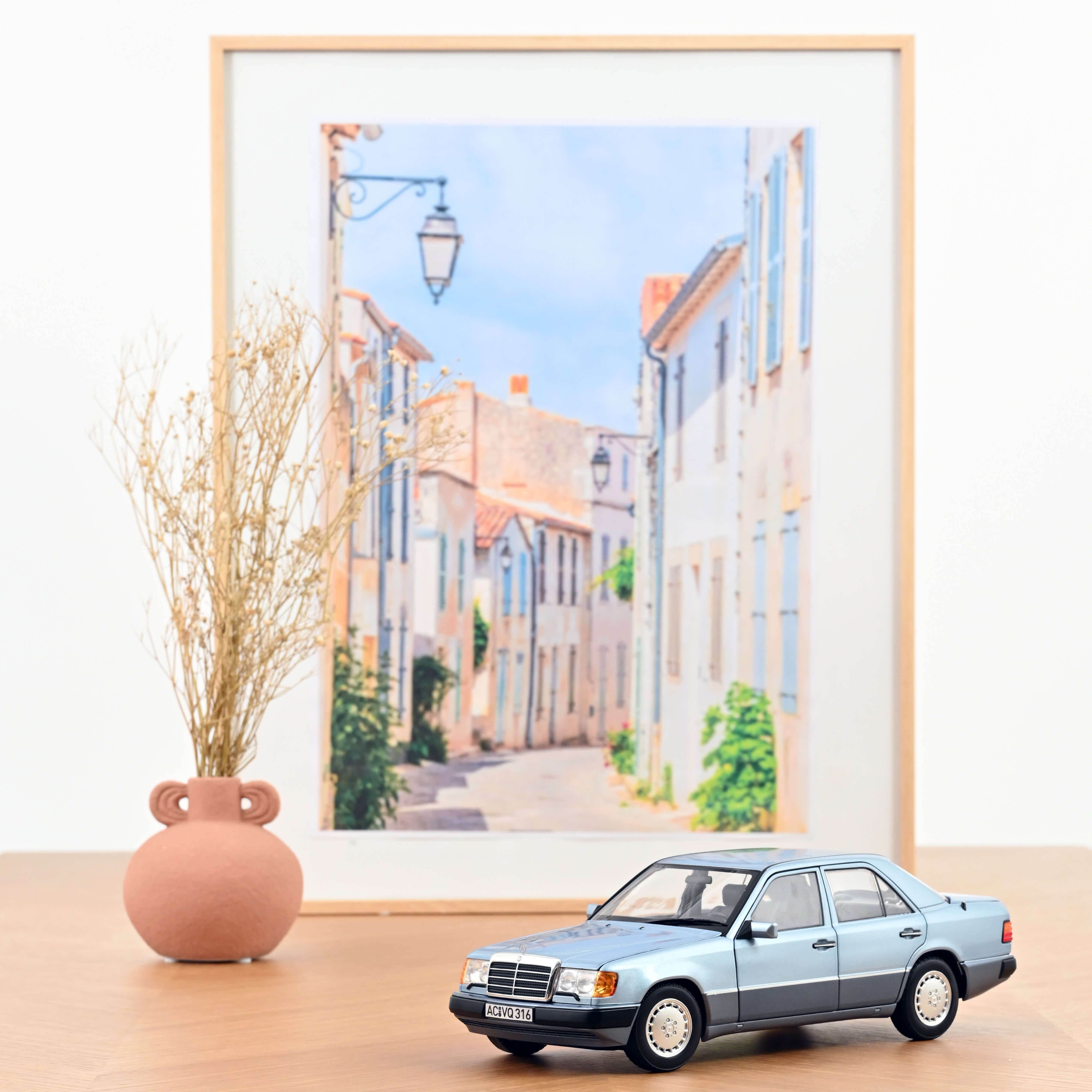 Carrosserie bleu perle métallisé ( DB348 ), surfaces contrastées en bleu andor ( DB5301 ), tissu d'ameublement bleu - grâce à Norev, il existe enfin un modèle de la série W124 qui offre l'impression, l'élégance et la qualité de l'original au 1:18 dans les vitrines et sur les bureaux des collectionneurs.