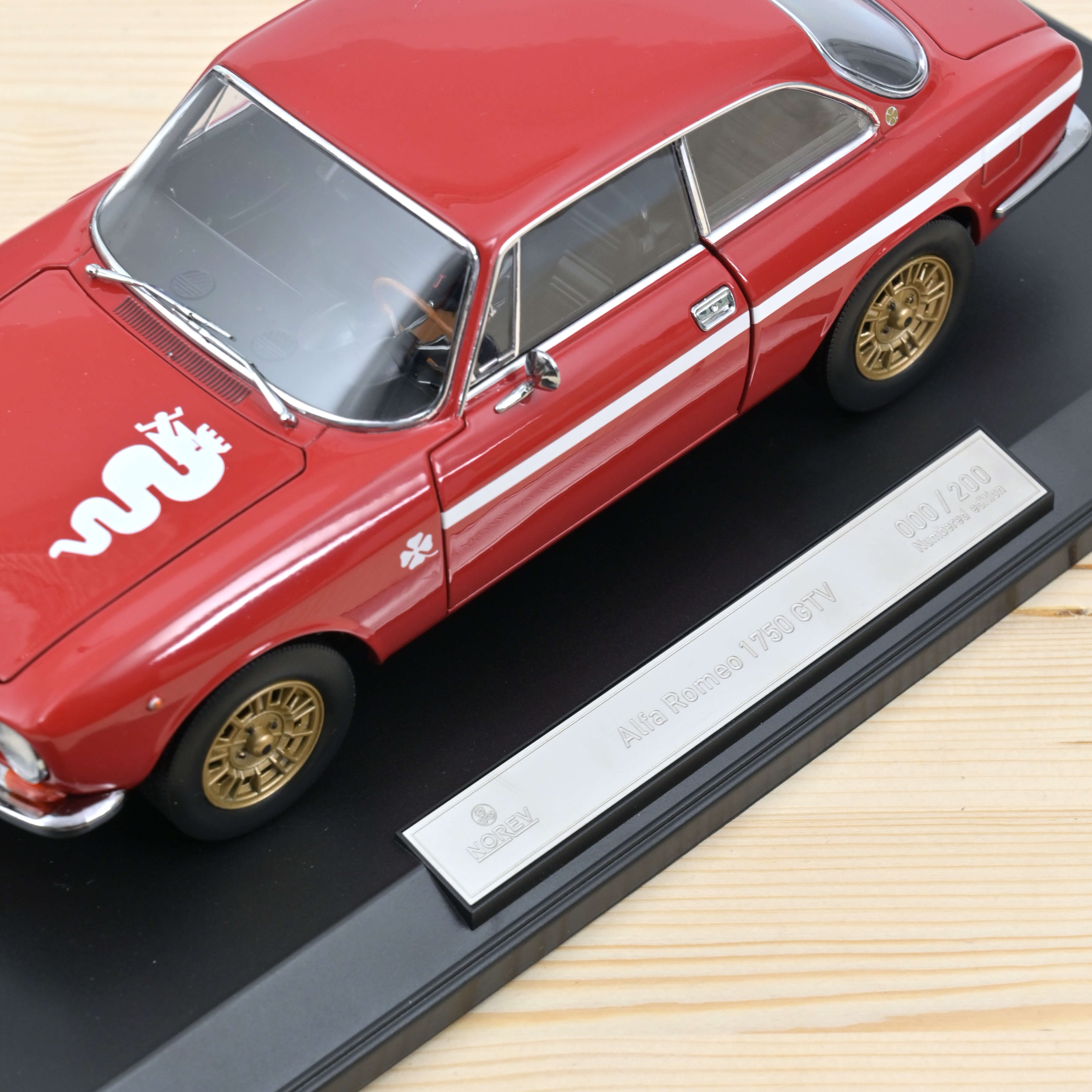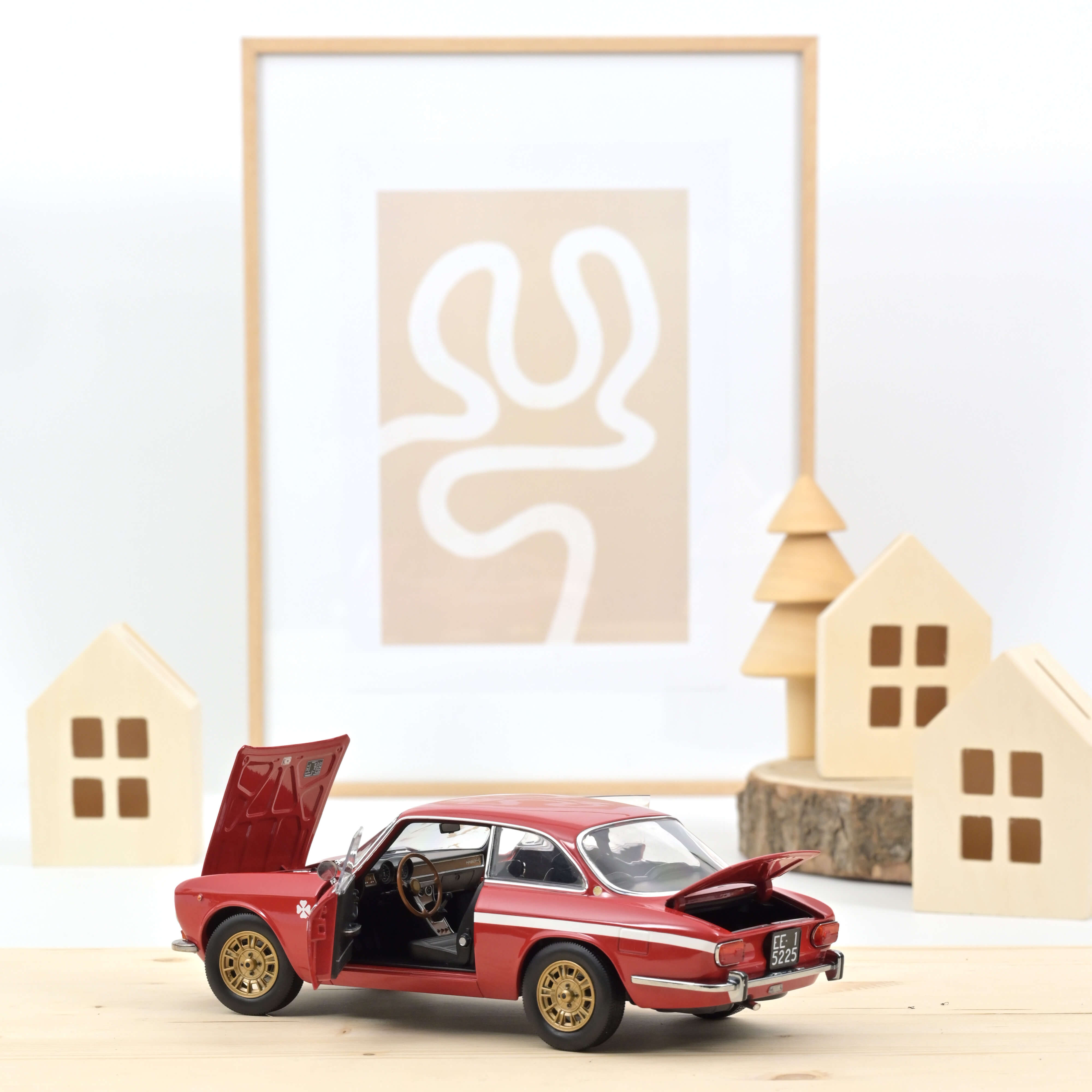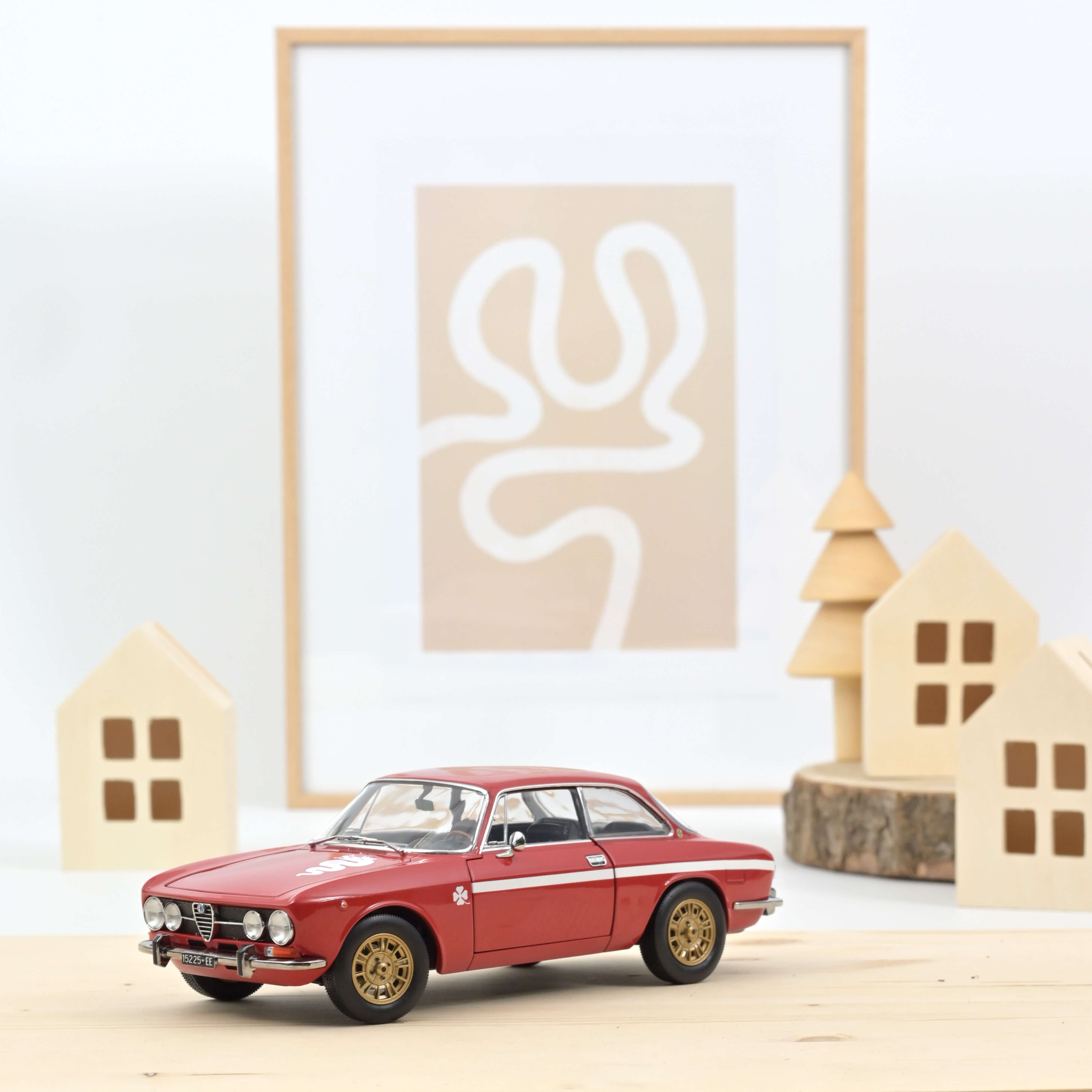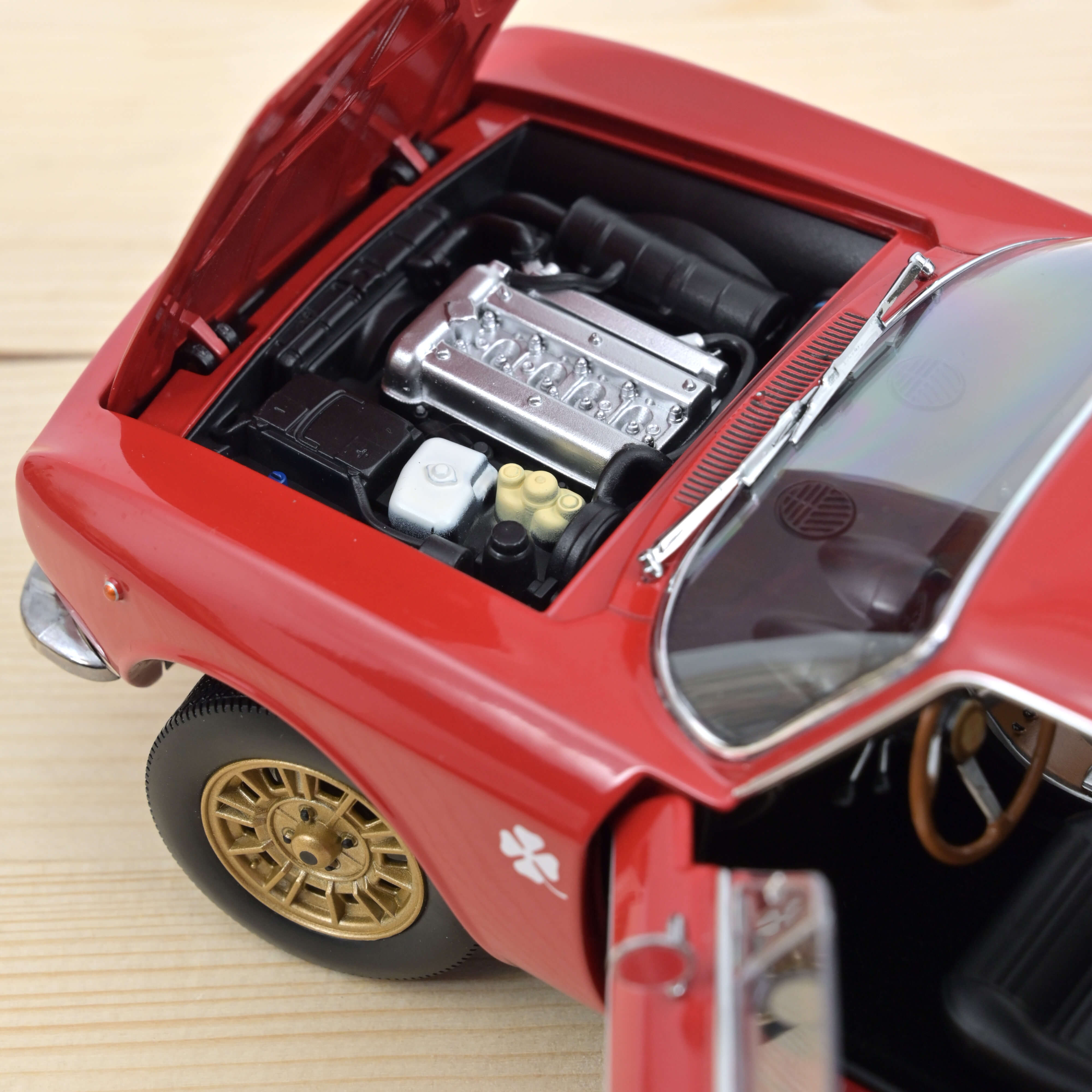 Peinte en Rosso Alfa classique, la maquette cite la décoration typique avec laquelle l'usine livrait les légendaires Giulia GTA au milieu des années 1960. Des jantes en alliage léger FPS contemporaines, peintes en or, soulignent le caractère sportif de la miniature.