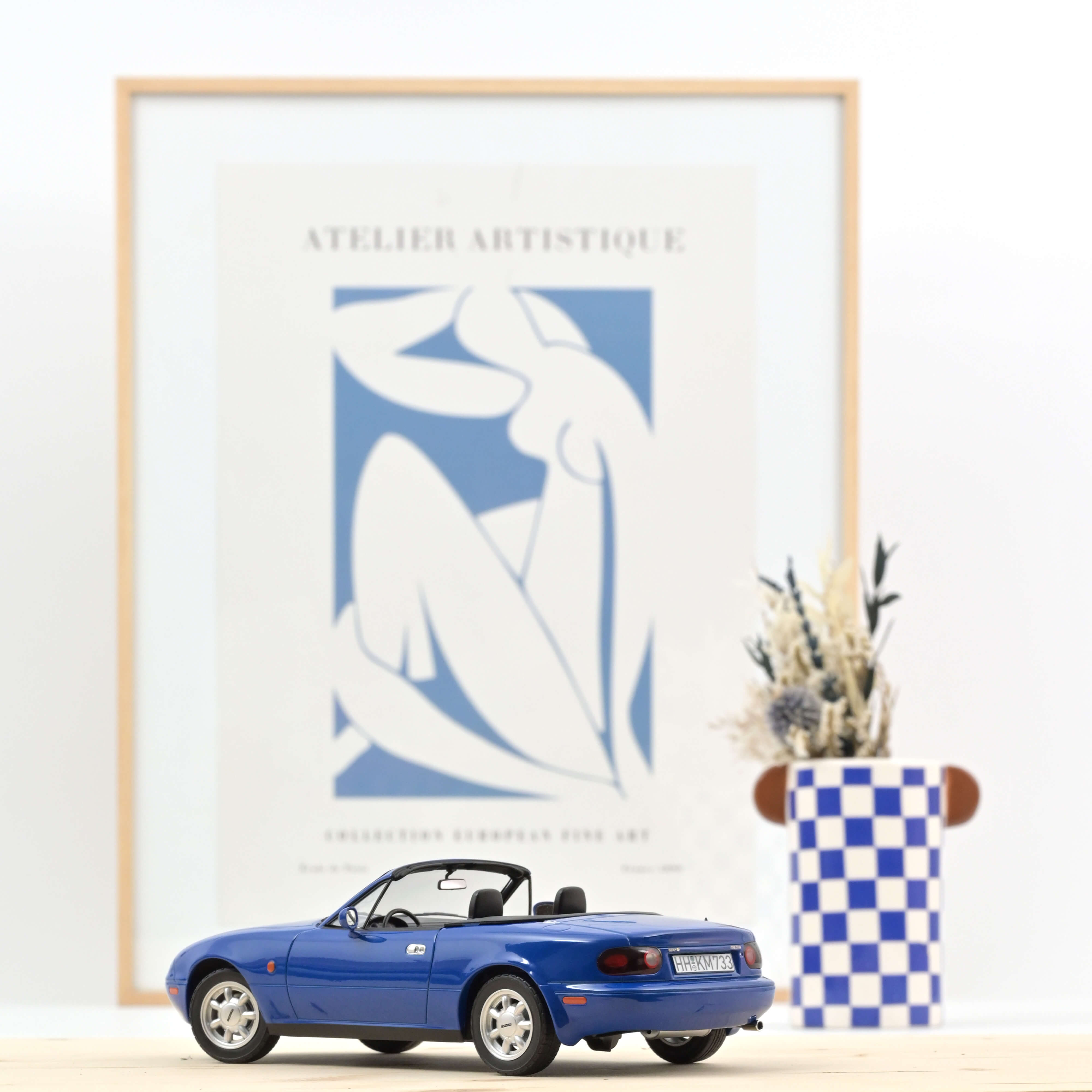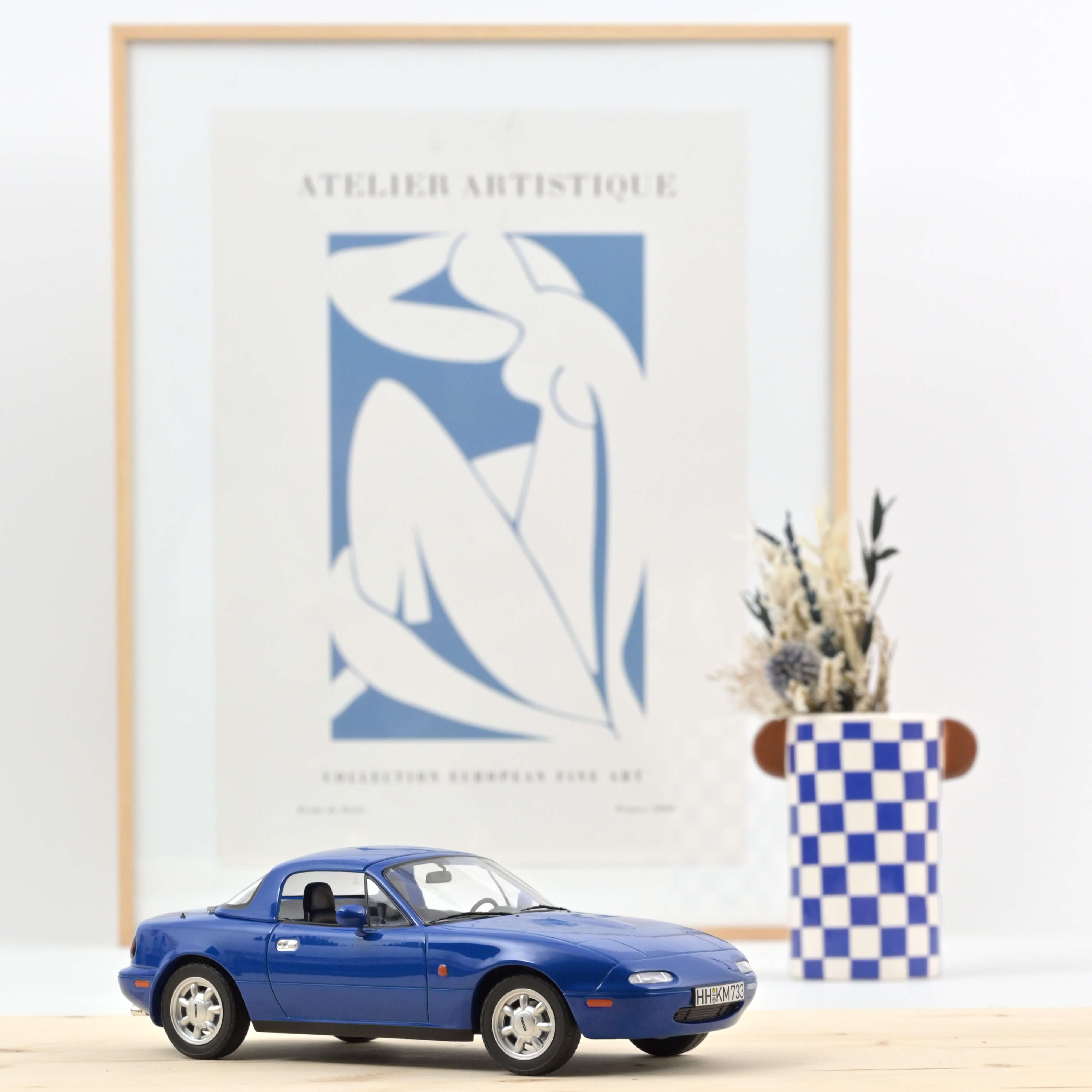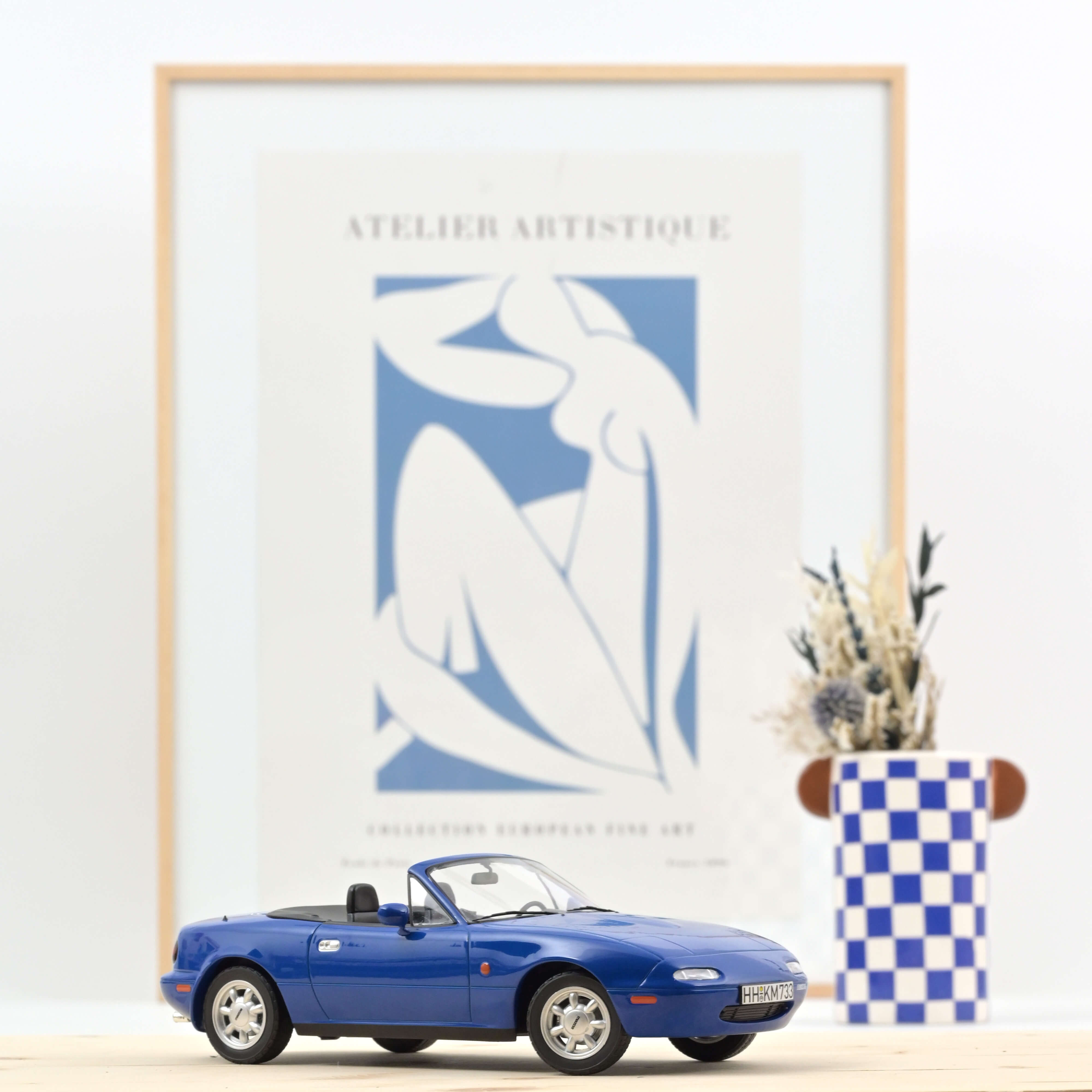 Le modèle Norev de la petite voiture de sport japonaise convainc par sa reproduction parfaite des lignes à la fois sobres et sensuelles de la MX-5. Le modèle est peint en bleu marine, une couleur qui ne passe pas inaperçue - à l'époque, c'était la teinte la plus populaire, avec le rouge et l'argent, en combinaison avec un intérieur noir.