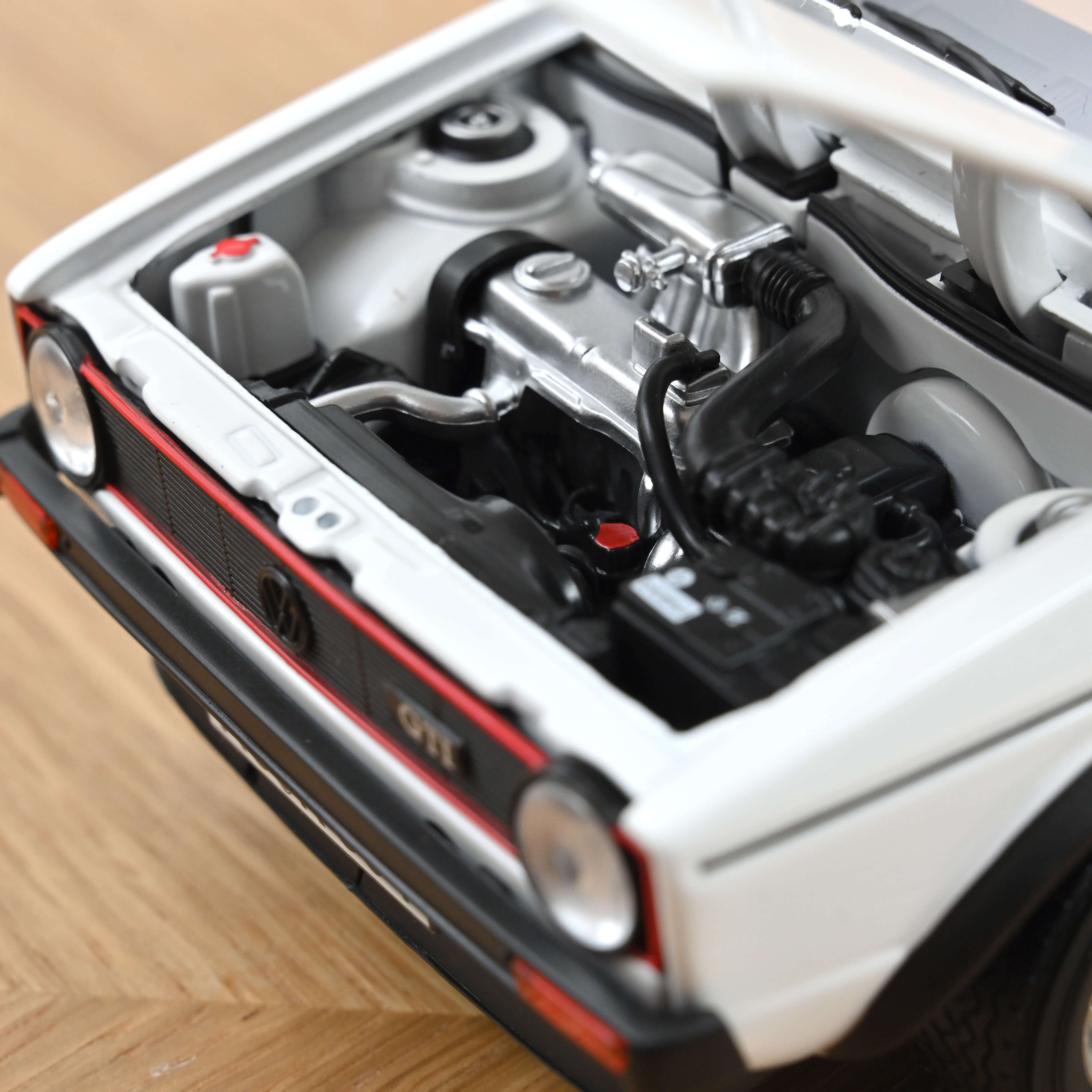 Notre modèle reproduit son équipement marquant, comme les accents rouges classiques de la calandre et les sièges sportifs, aussi exactement que l'apparence extérieure de la Golf GTI, qui reste aujourd'hui encore un objet culte parmi les amateurs de voitures.