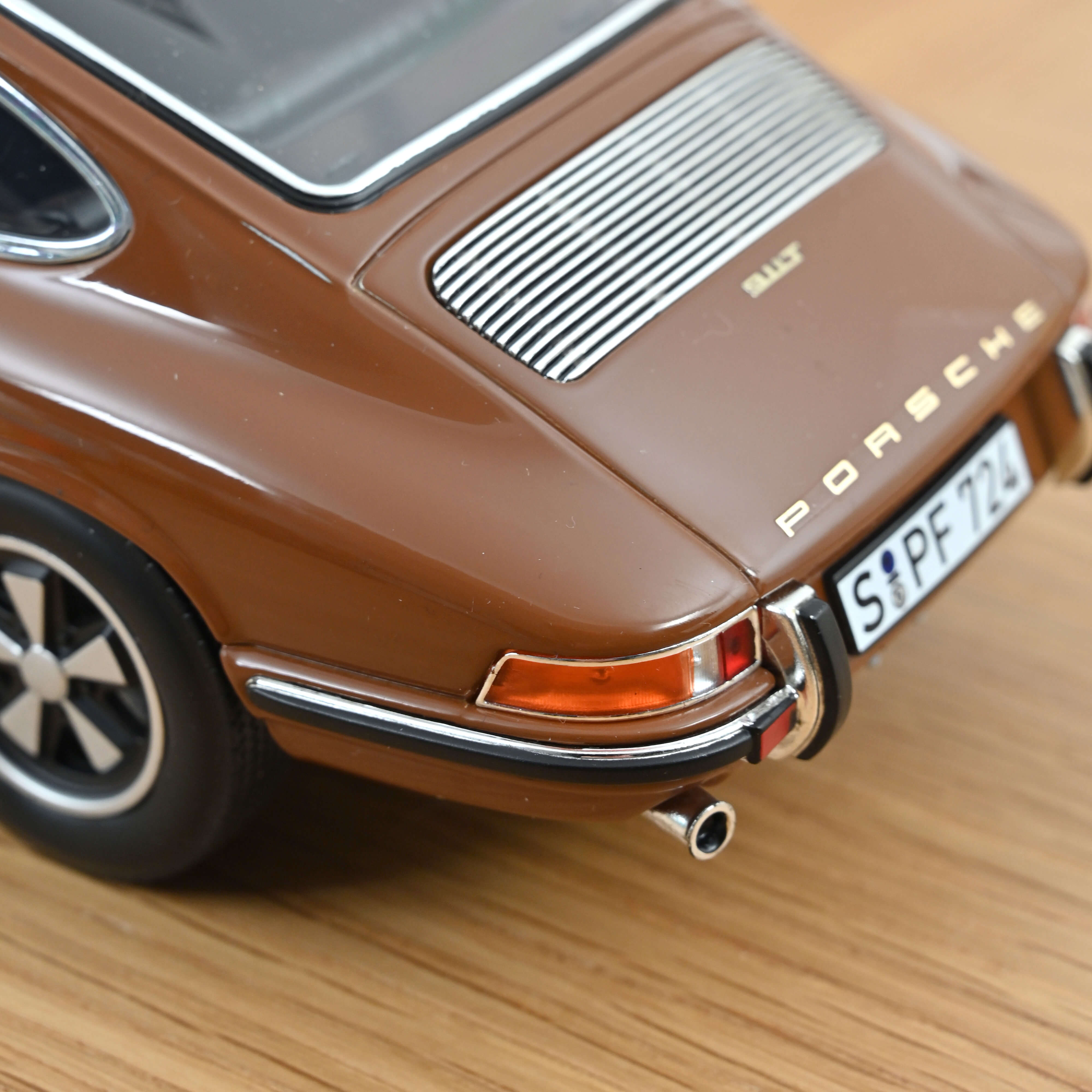 Sepiabraun – auf diesen Namen hört die Farbe, die wir für unser Modell gewählt haben. Kombiniert mit einem schwarzen Innenraum zeigt es einen typischen 911er aus der Zeit, als Parkplätze ebenso bunt waren die Swinging Sixties.