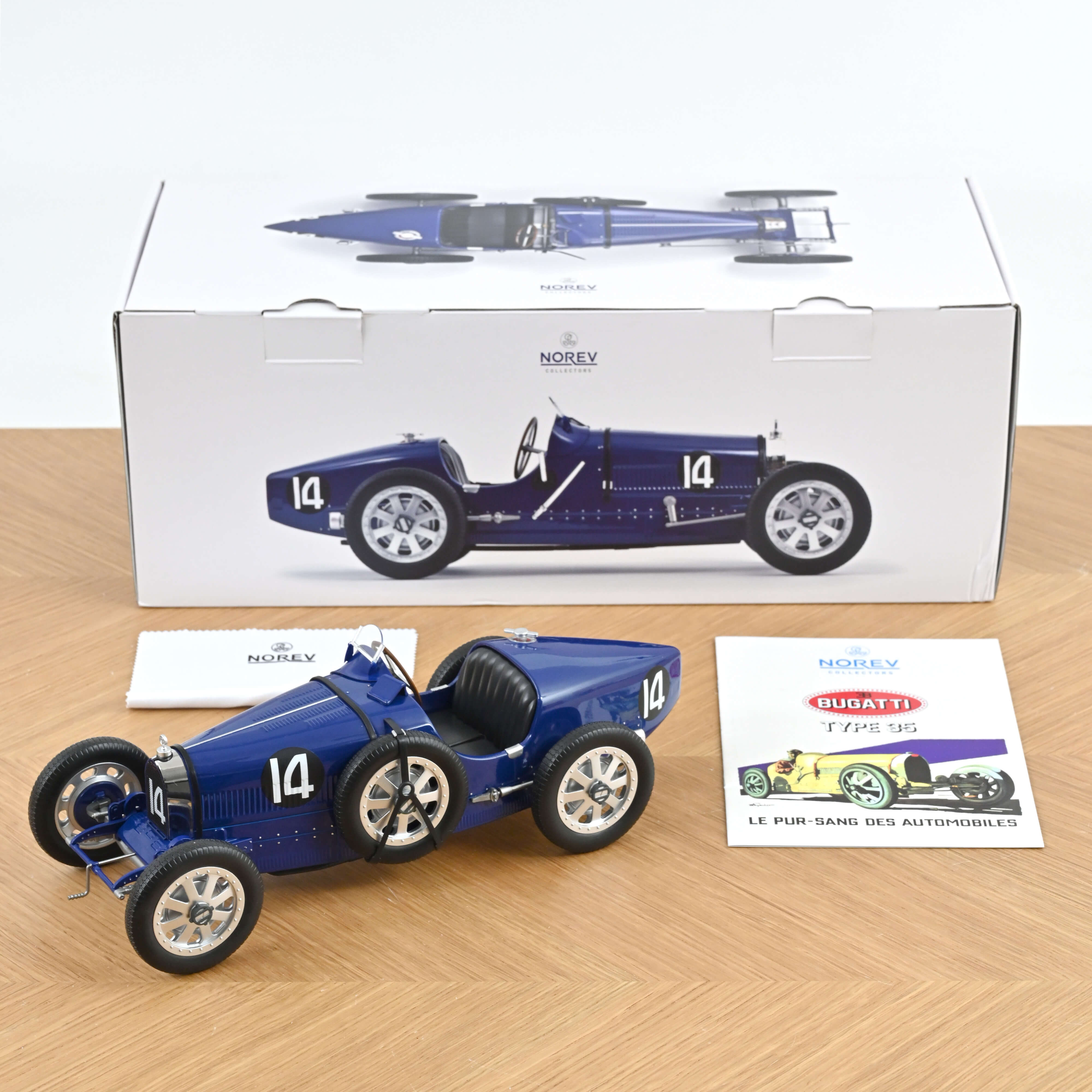 Das Norev Modell im Groß-Maßstab 1/12 zitiert einen typischen T35, wie er über die Rennstrecken Europas fegte und von Sieg zu Sieg fuhr. Neben den Startnummern sticht vor allem der fotogeätzte Zusatzgrill hervor, der den empfindlichen Kühler vor Schäden schützen sollte.