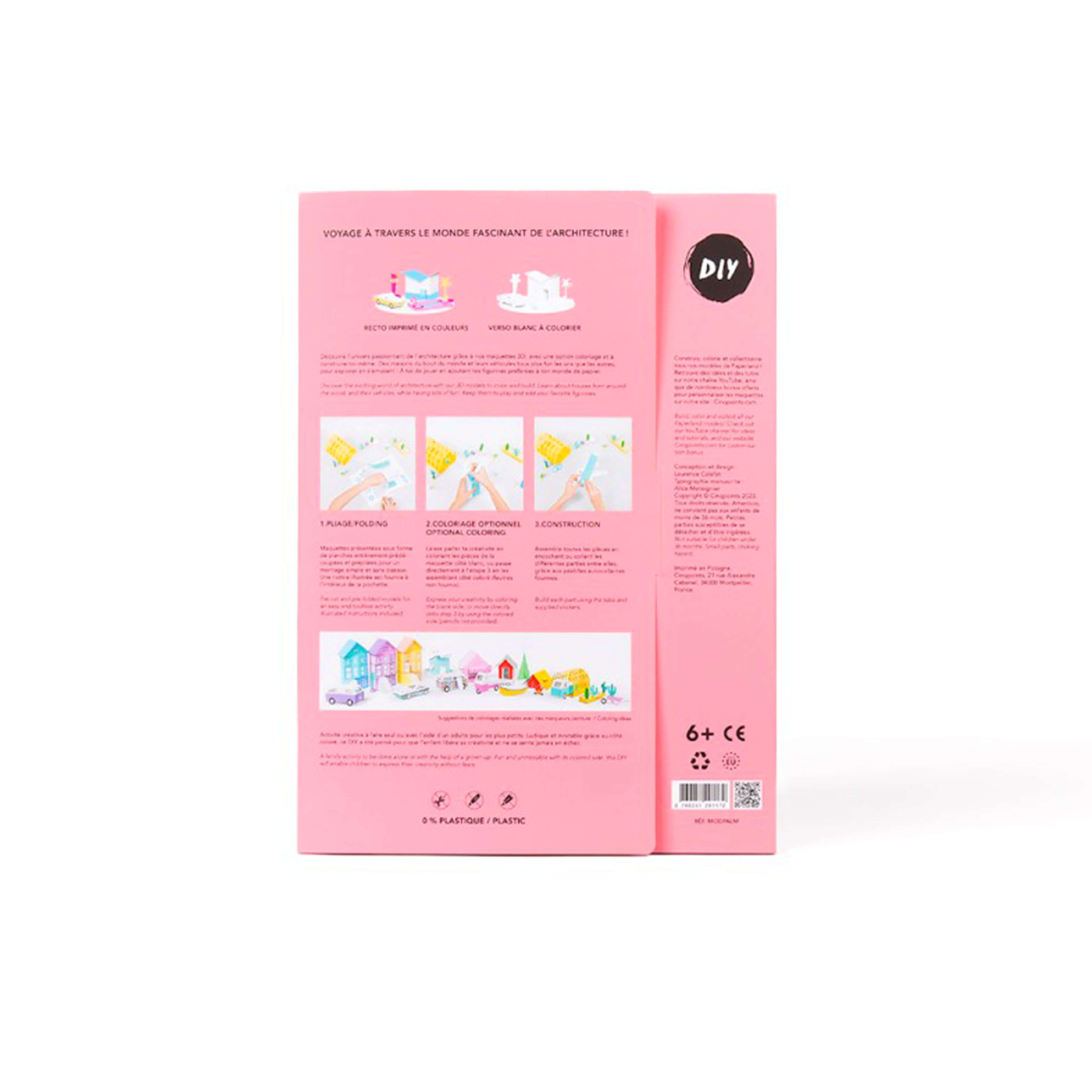 Papiermodell-Bausatz für Kinder, zum Zusammenbauen und Bemalen, um eine Reise durch die faszinierende Welt der Architektur zu unternehmen.