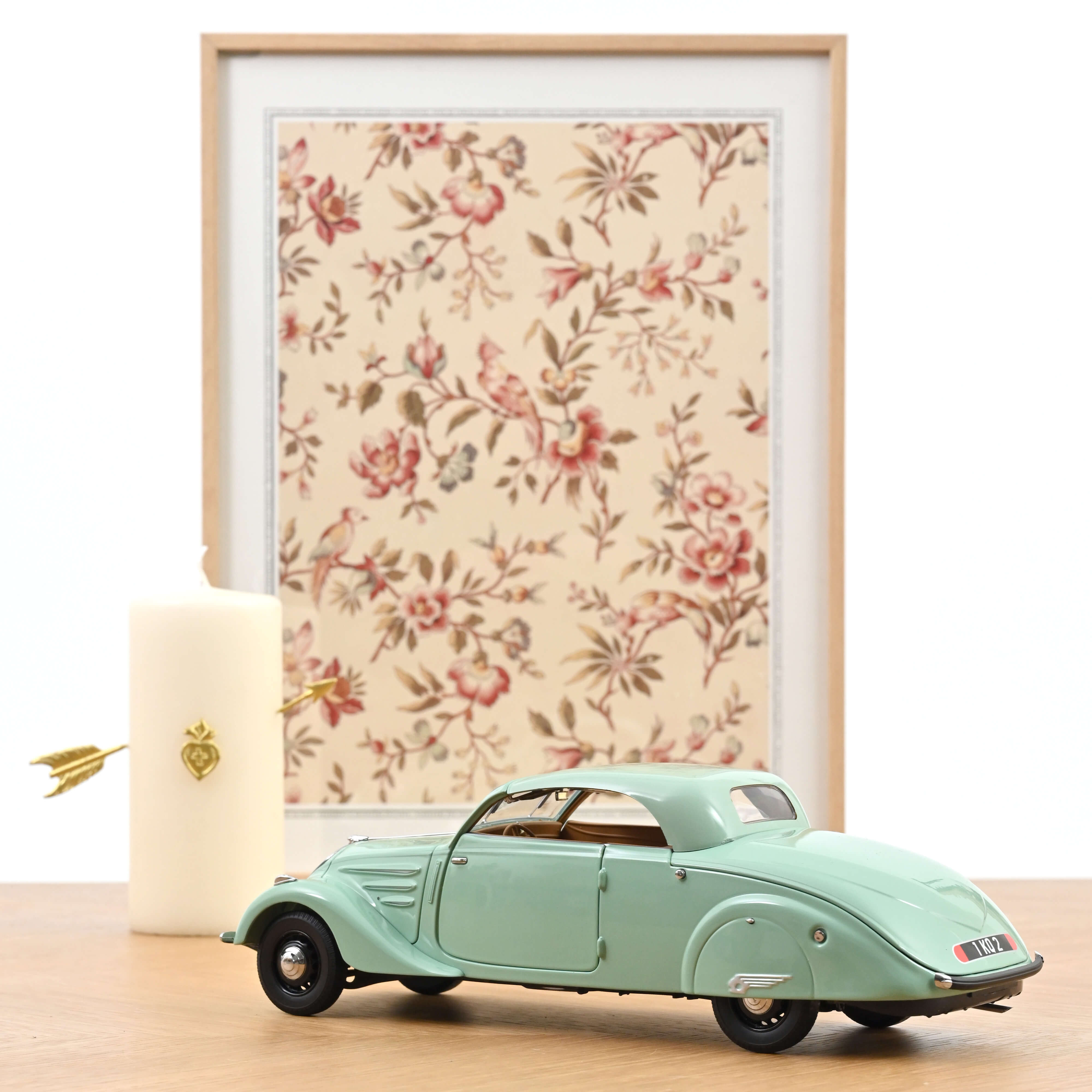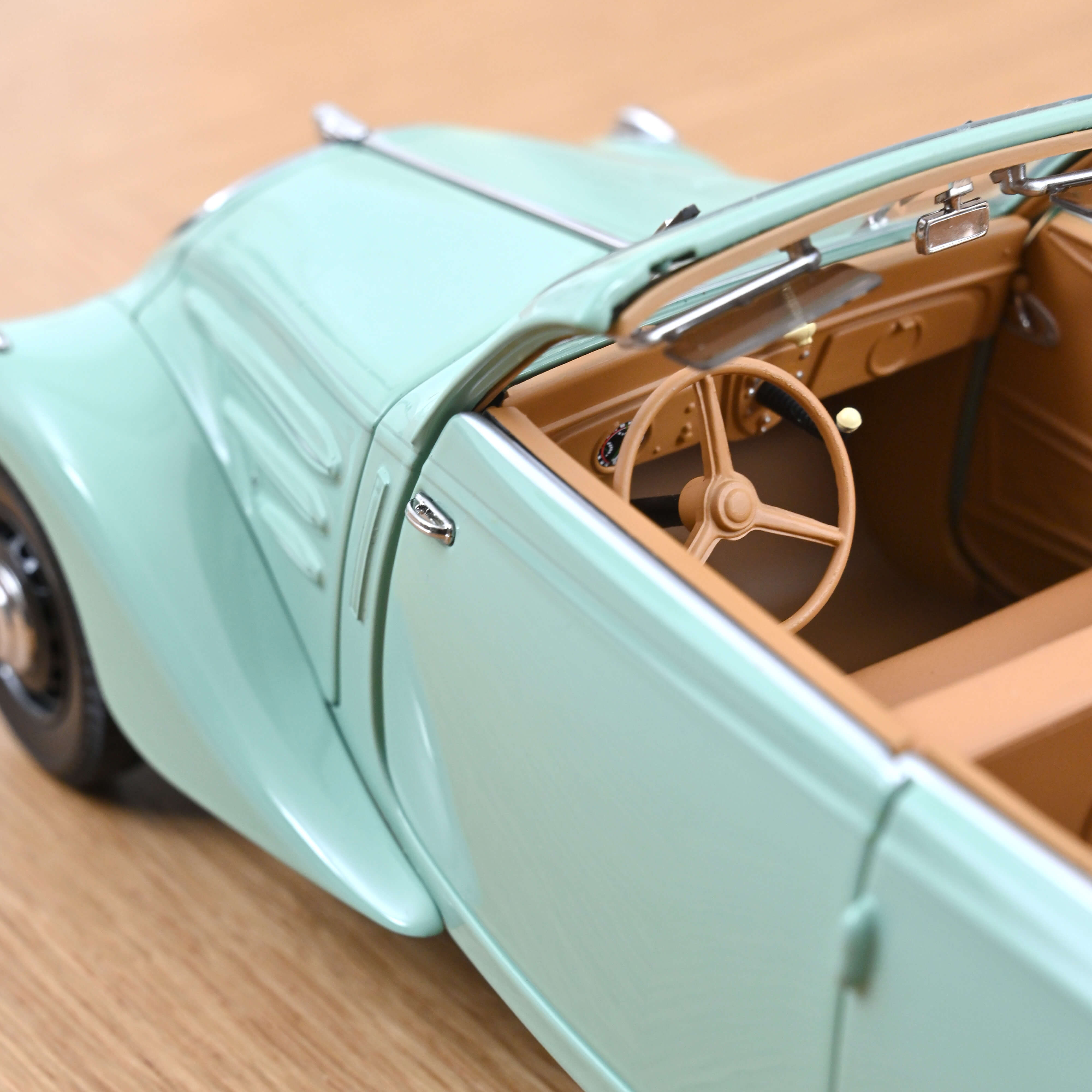 Norev bietet eine Sonderausgabe des Peugeot 402 Éclipse-Modells in Wassergrün an, das mit einem feinen dunkleren Streifen für zusätzlichen Stil akzentuiert ist. Das beige Interieur, das den kleinen Koffern im Kofferraum entspricht, erinnert an den Luxus dieses Oldtimers.