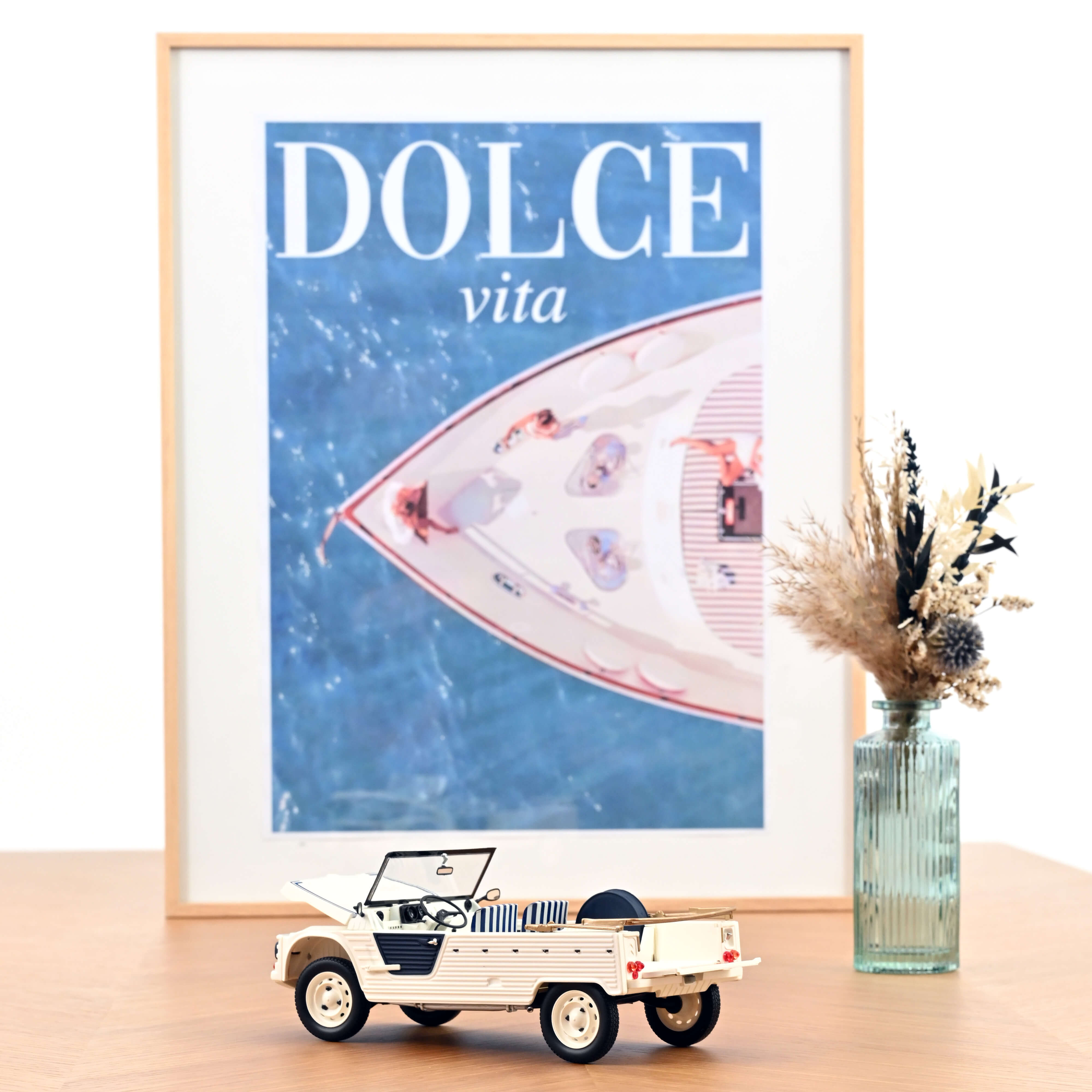 Im Innenraum verfügt der Méhari Azur über Sitze aus blau-weiß gestreiftem Stoff.