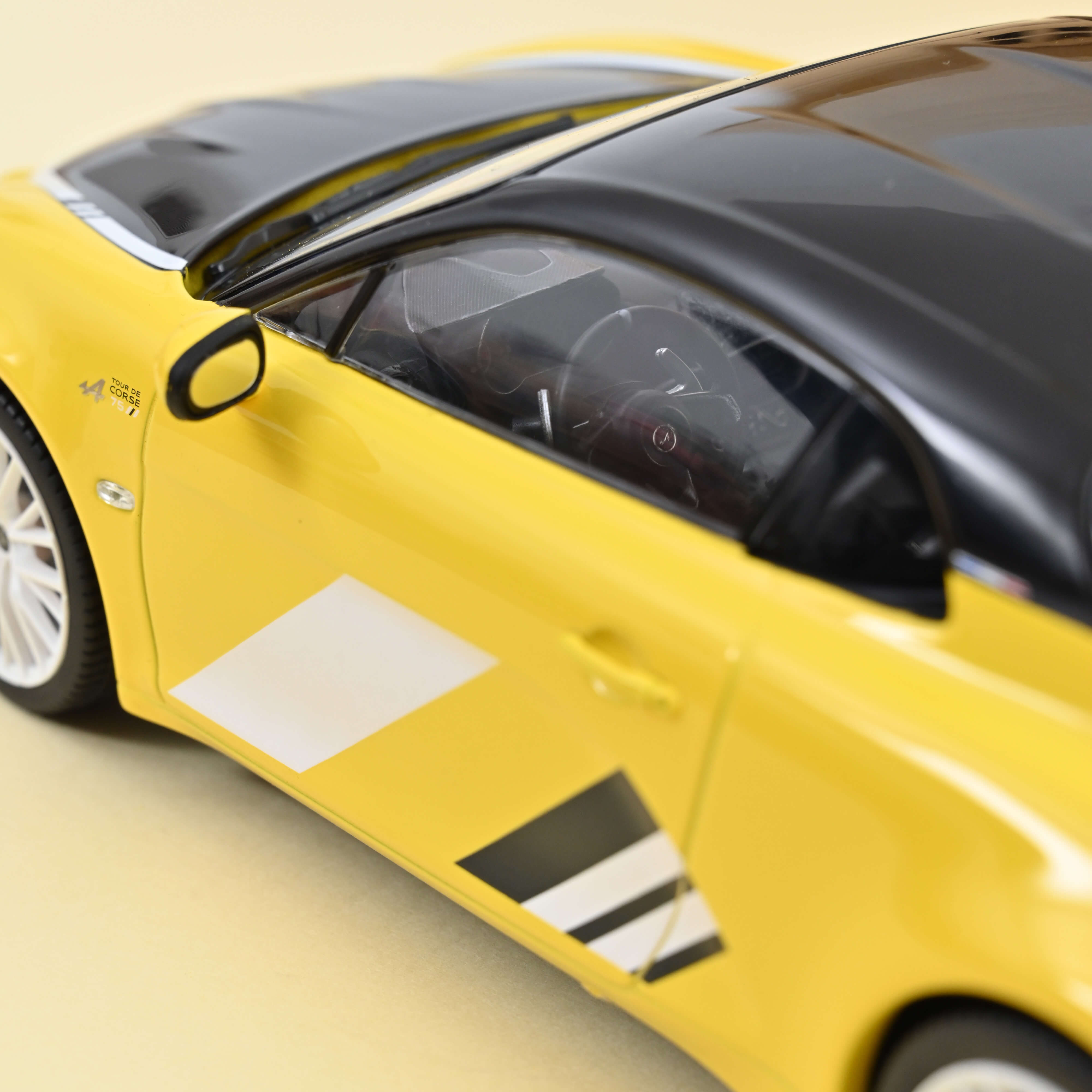 Der Alpine A110 Tour de Corse 75 ist eine Hommage an die Berlinette Nr. 7 der Rallye Tour de Corse 1975, dem legendären Rallye der 10.000 Kurven. Trotz deutlichen Leistungsnachteils gegenüber der Lancia Stratos gelang Alpine eine beeindruckende Aufholjagd. 2022 interpretierte Alpine die gelb-schwarz-weiße Lackierung auf einer 300-PS-A110 neu, limitiert auf nur 150 Fahrzeuge. Norev greift diese Exklusivität auf und bietet eine originalgetreue 1/18-Miniatur ohne Öffnungen, ebenfalls auf 150 Stück limitiert.