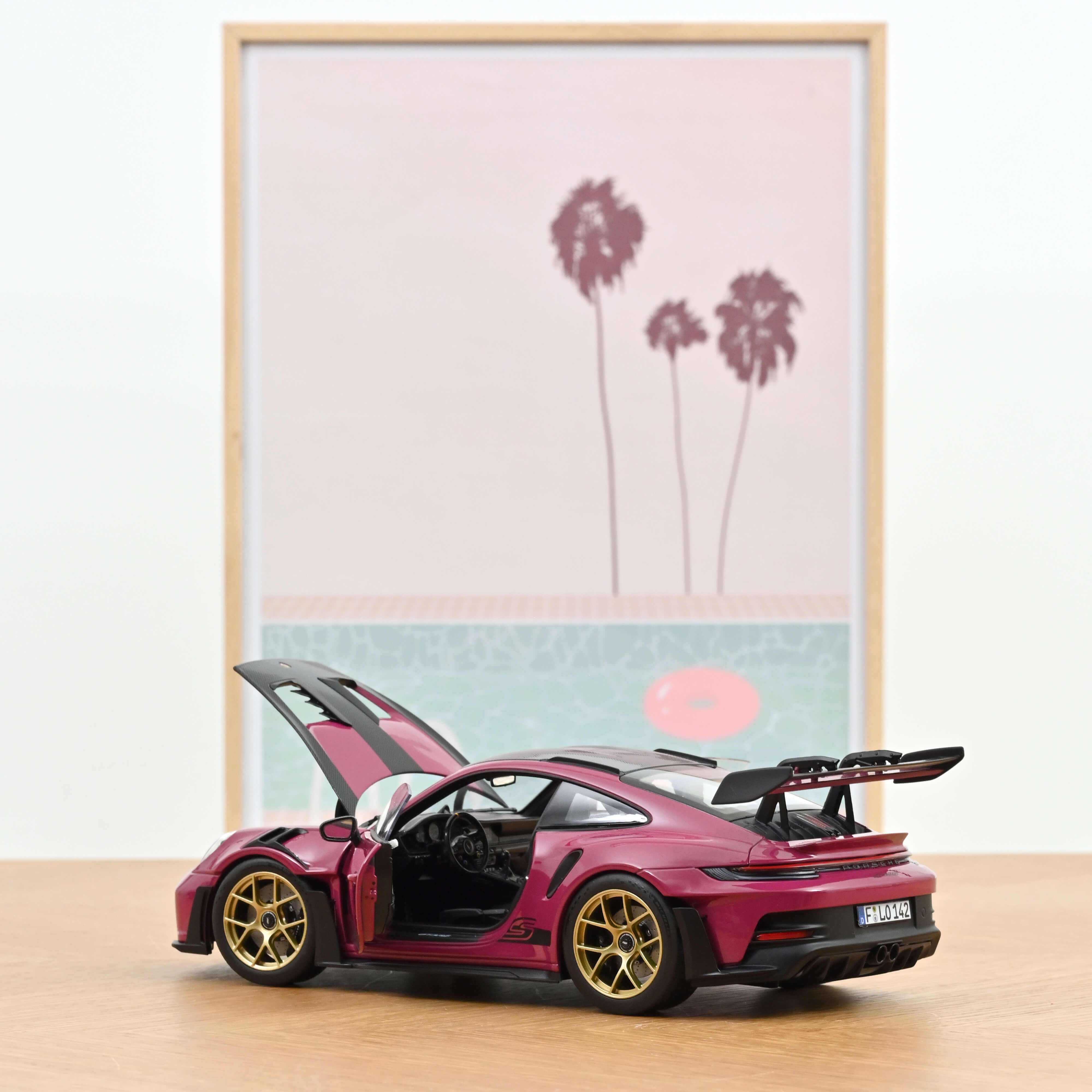 Our highly detailed Porsche 911 GT3 RS in 1/18 scale impresses with its excellent workmanship and attention to detail. The opening parts include doors and boot lid, which allow a view of the finely crafted interior and the detailed boot with cooling air ducting. Particularly noteworthy are the grilles made from photo-etched parts, which give the model a realistic look. The paintwork in eye-catching star ruby with coloured accents and golden rims round off the elegant and sporty appearance.