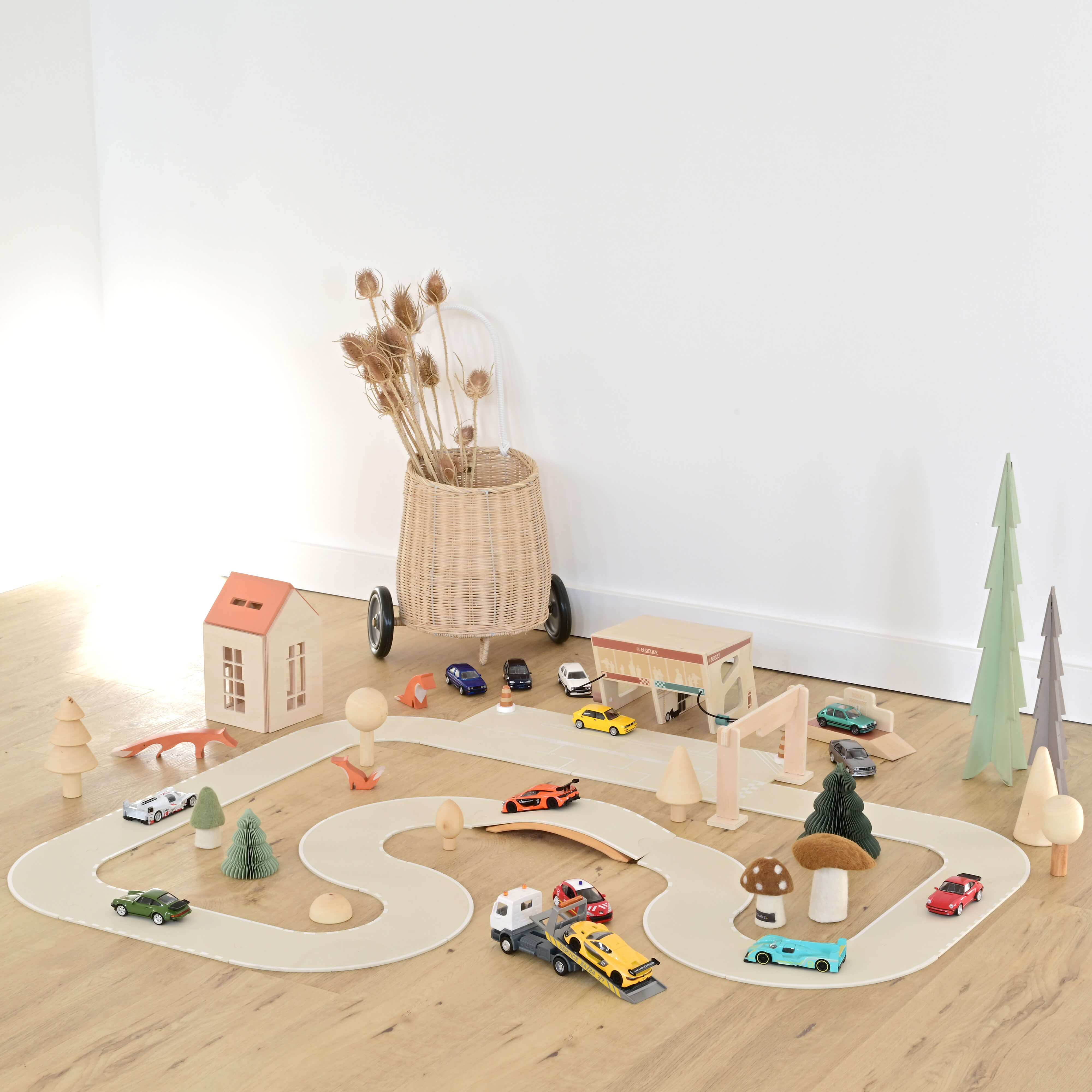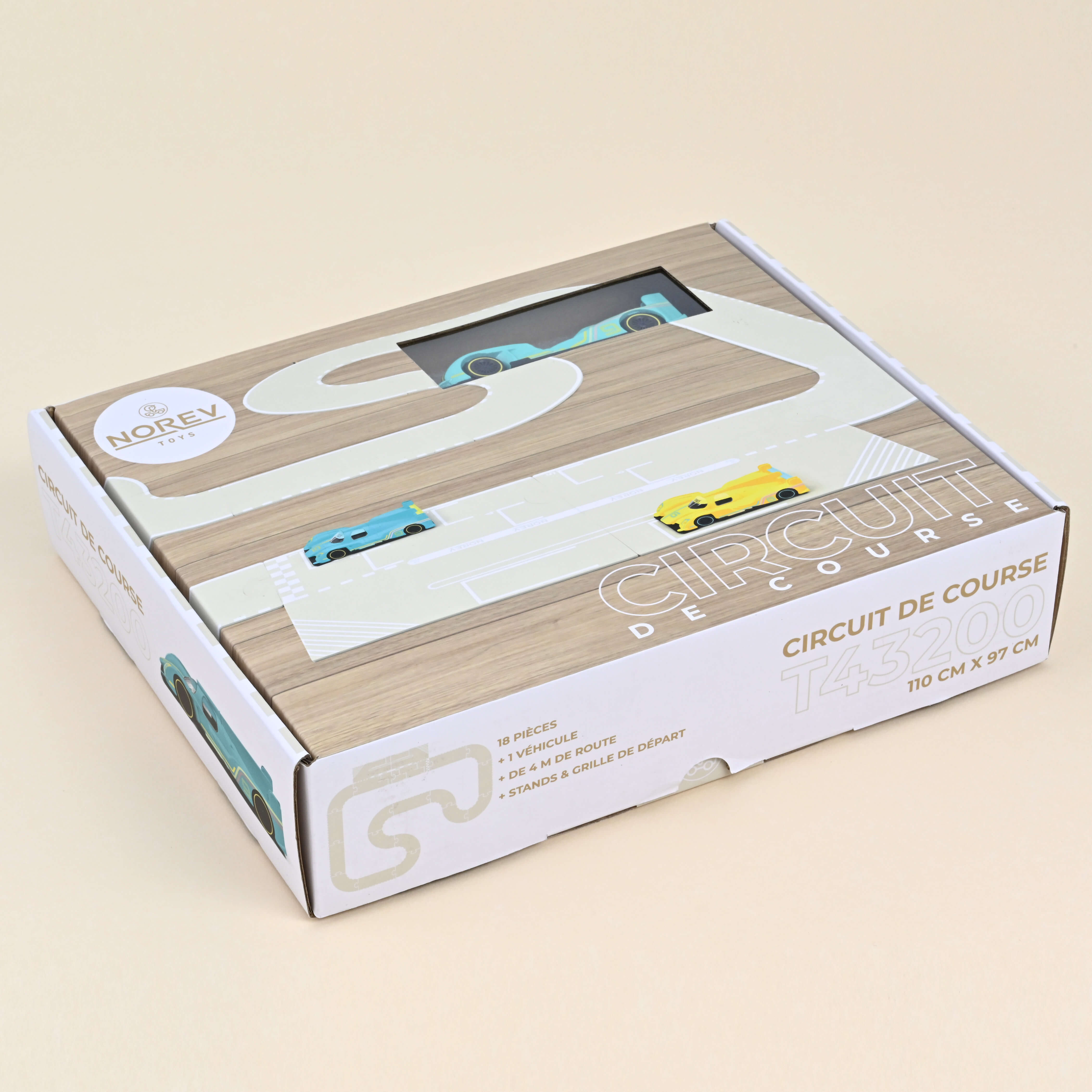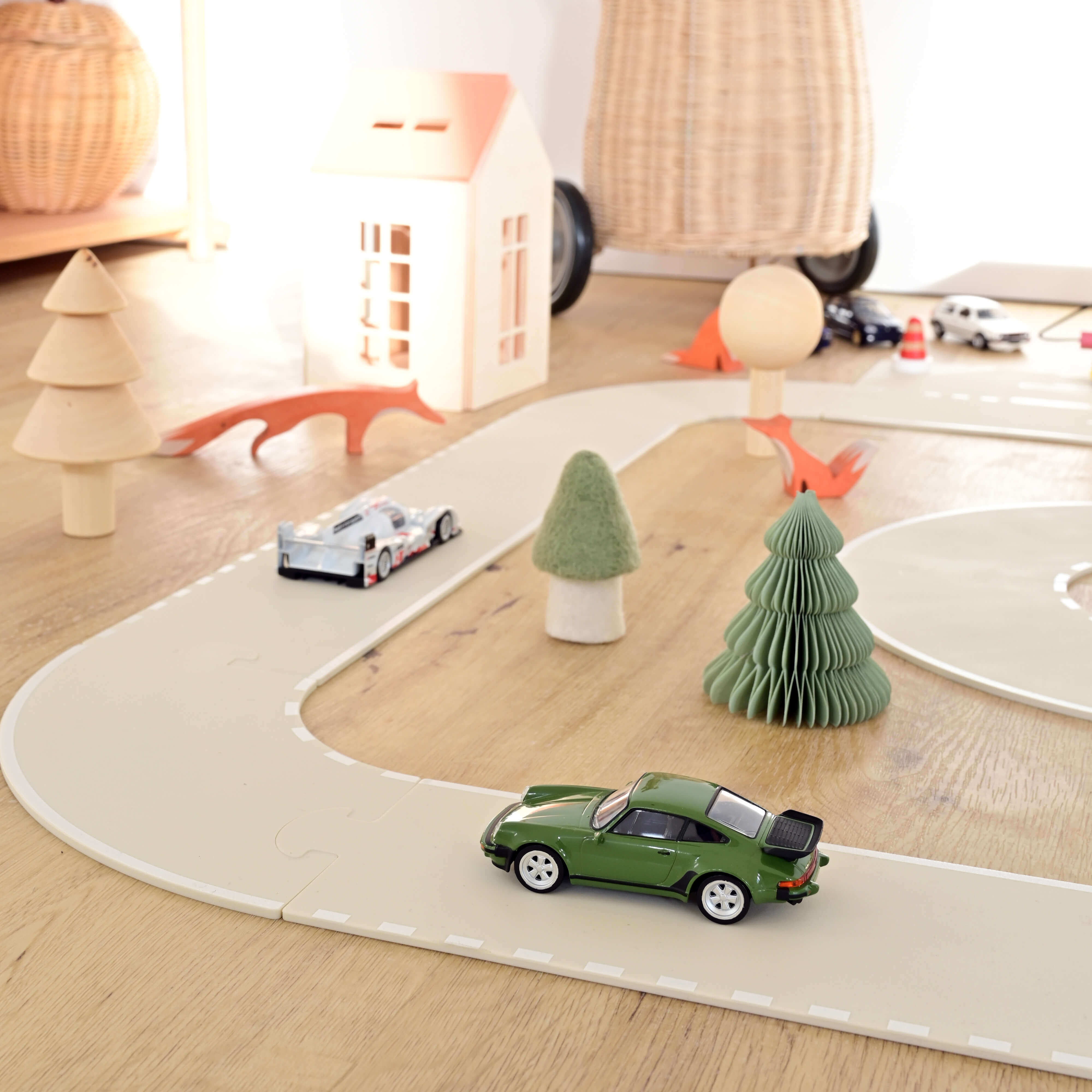 Our racing track for car models is composed of 18 flexible silicone pieces, to be easily assembled like a jigsaw puzzle (pits and starting grid, more than 4 meters of road).