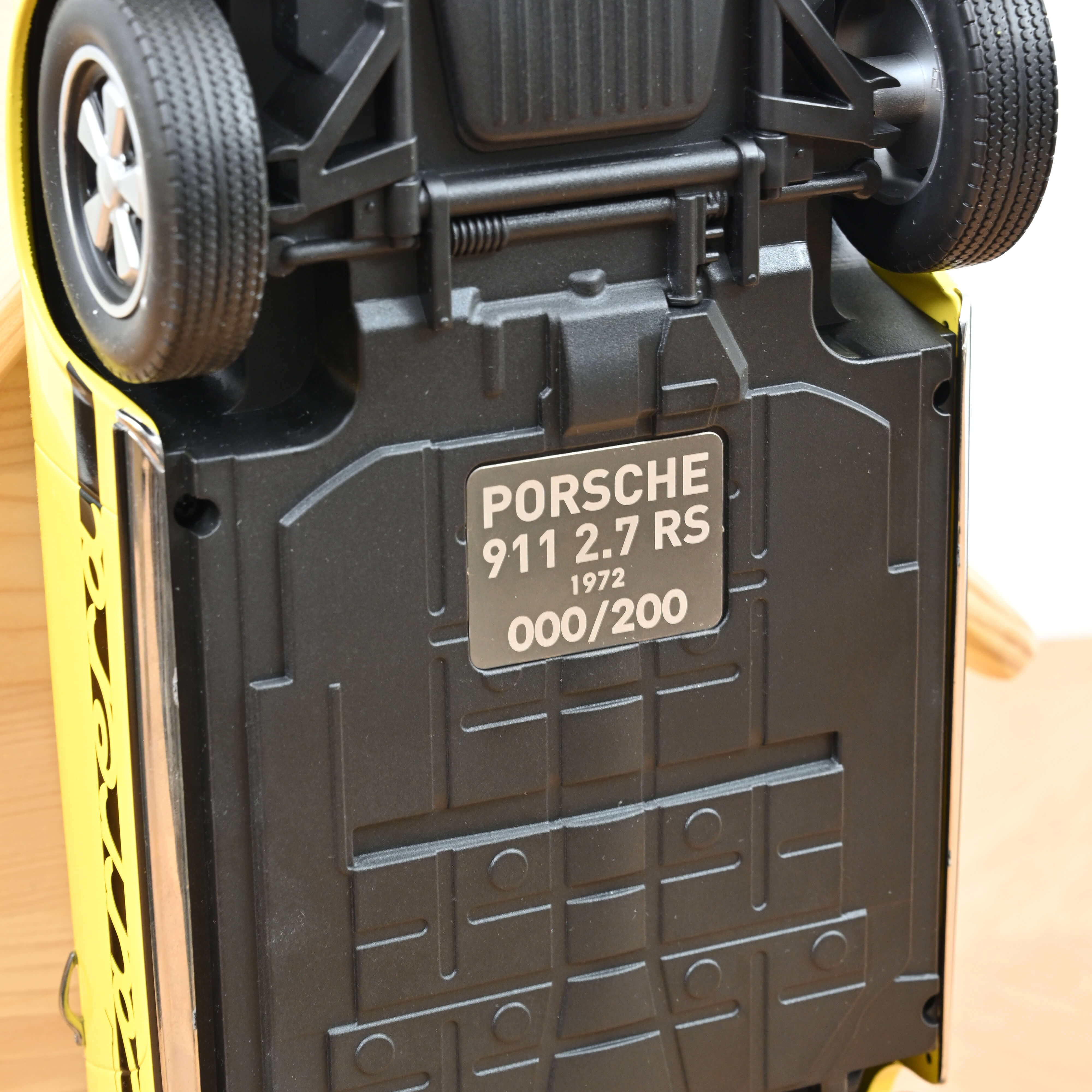 The Carrera RS 2.7 is considered the epitome of lightweight design in road vehicles. Originally developed as a homologation model for motorsport, it was the first production car to feature both front and rear spoilers. Particularly striking is its light yellow paintwork with black stripes, which emphasizes the car’s sporty character. Through targeted weight reduction, an optimized chassis, and an upgraded engine, the RS 2.7 became the fastest production car of its time—thanks in part to its iconic "ducktail" spoiler. Although only 500 units were initially planned, demand far exceeded expectations. In the end, 1,580 cars were built, 1,308 of which were the Touring version we faithfully replicate in 1:12 scale.