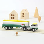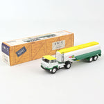 Enfin me voici propriétaire d'un modèle que je n'ai pu acquérir dans ma jeunesse, tant les moyens faisaient défaut ! Un magnifique modèle destiné à être exposé en vitrine car les superstructures me paraissent fragiles : la béquille doit être manipulée avec précaution, je n'ai pas " osé " forcer le bouchon de remplissage de la citerne ni le robinet de vidange - une peur non fondée de détériorer ces pièces en plastique ? - et sur mon exemplaire la roue droite du tracteur qui gondole sur l'axe
