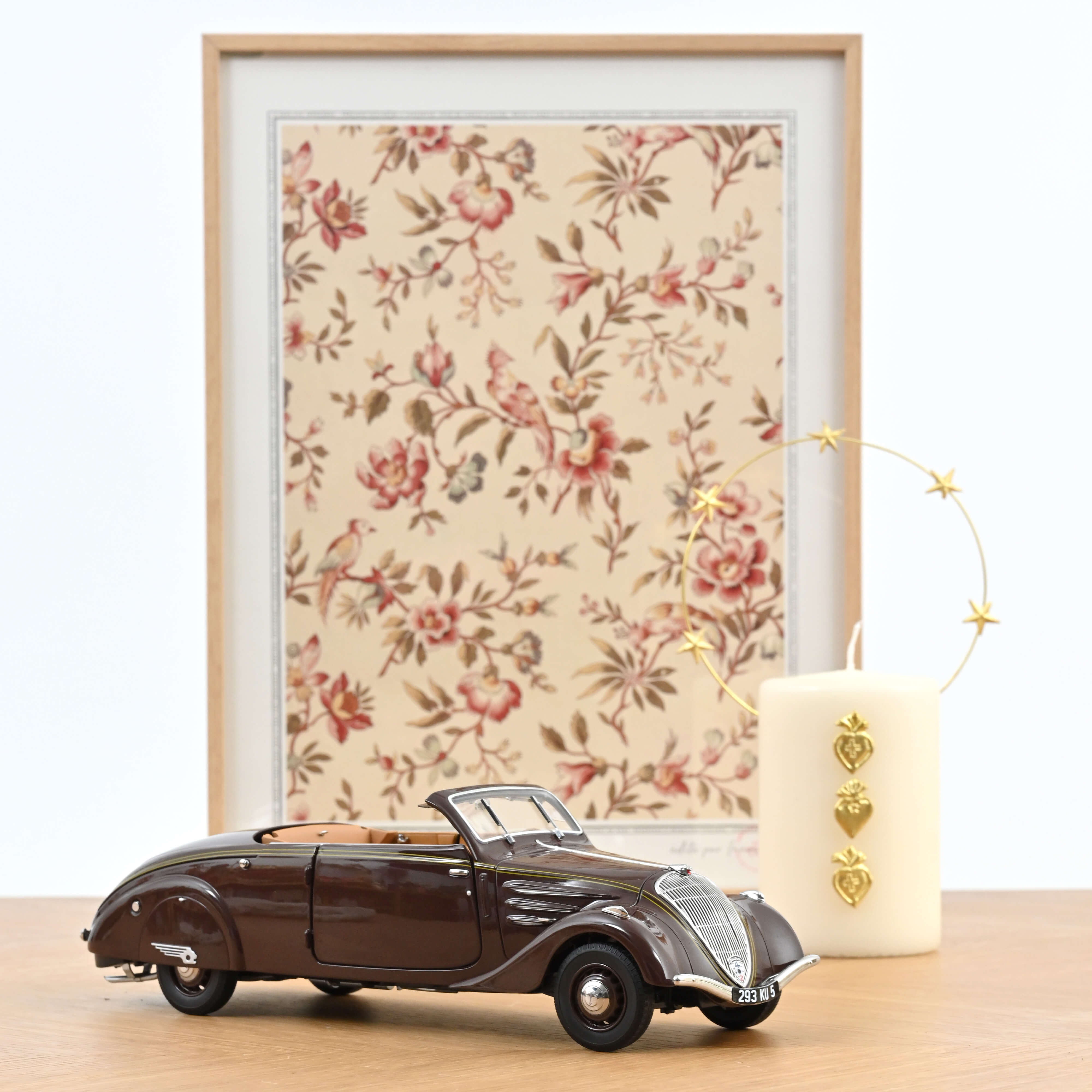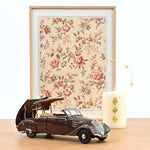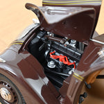 Norev honours this innovation with a 1/18 scale model in chocolate brown with a beige interior, equipped with a retractable roof system true to the original. The model is finely detailed, featuring a beige double line along the body. This miniature version includes five openable parts (hood, doors, and boot) and comes with two removable suitcases in the boot, capturing the elegance and ingenuity of the 1937 design.