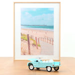 This variant of the Mehari, in an original light blue with white seats and soft top, is still very much in vogue, and is an invitation to relax and go on holiday.