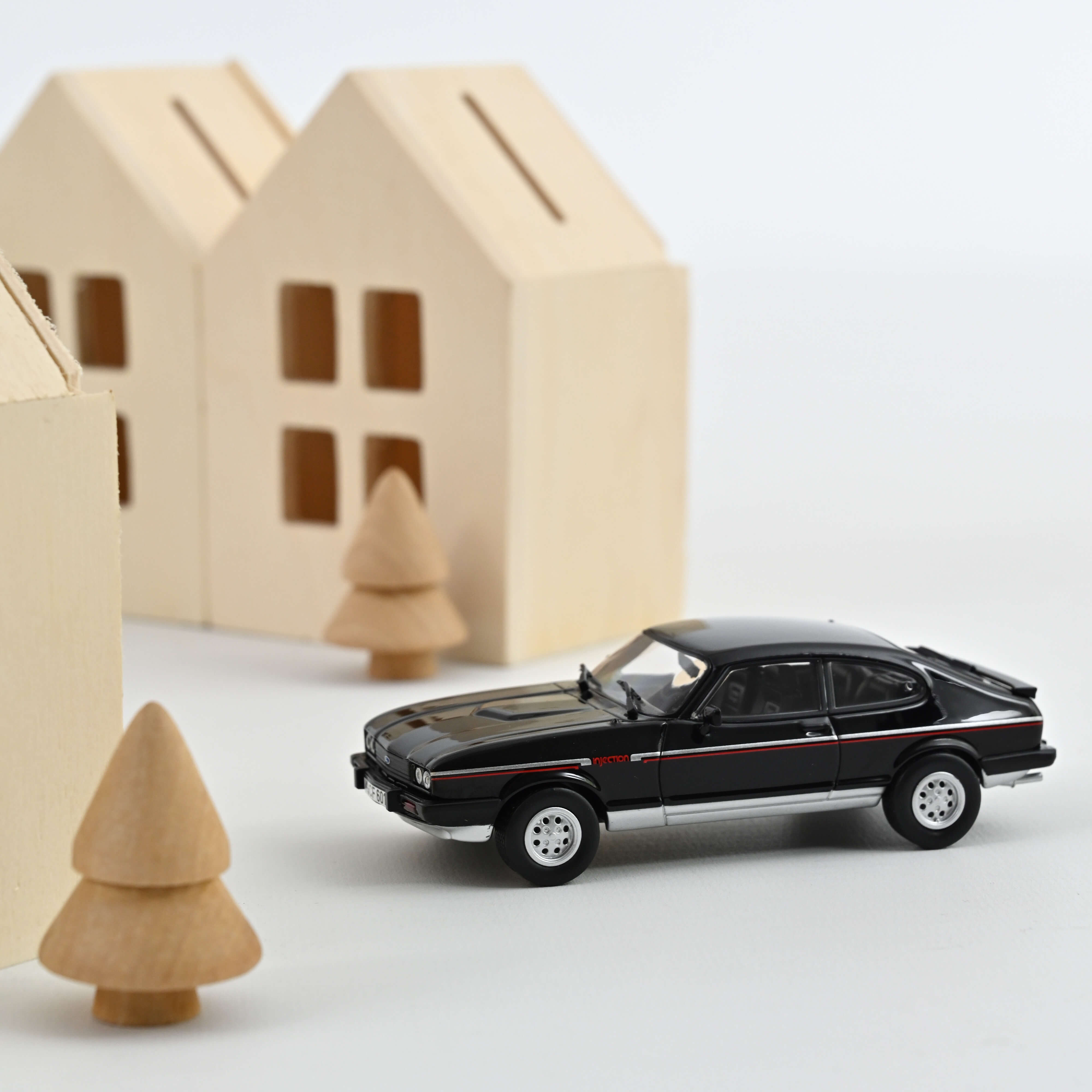 Fine details such as the printed stripes on the sides, the contrasting skirts or the contemporary alloy wheels characterise the Norev miniature of the Ford Capri, which is painted in a sporty yet understated black.