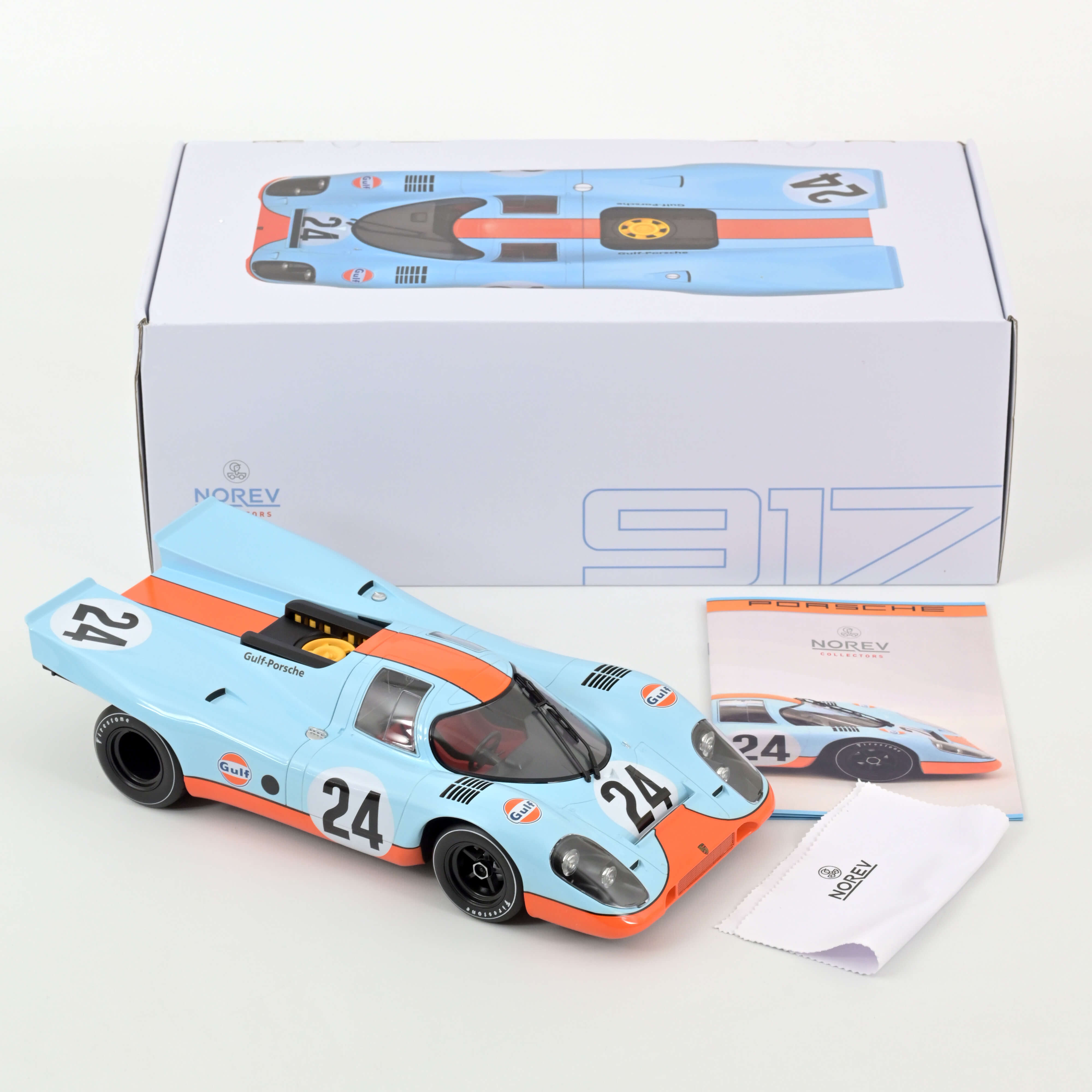 Gulf blue - that's the colour many people think of first when they talk about a Porsche 917. Specially mixed, the blue paint exactly matches the successful original cars. All the other special features of the 1970 Spa winner have also been meticulously reproduced on the Norev model.