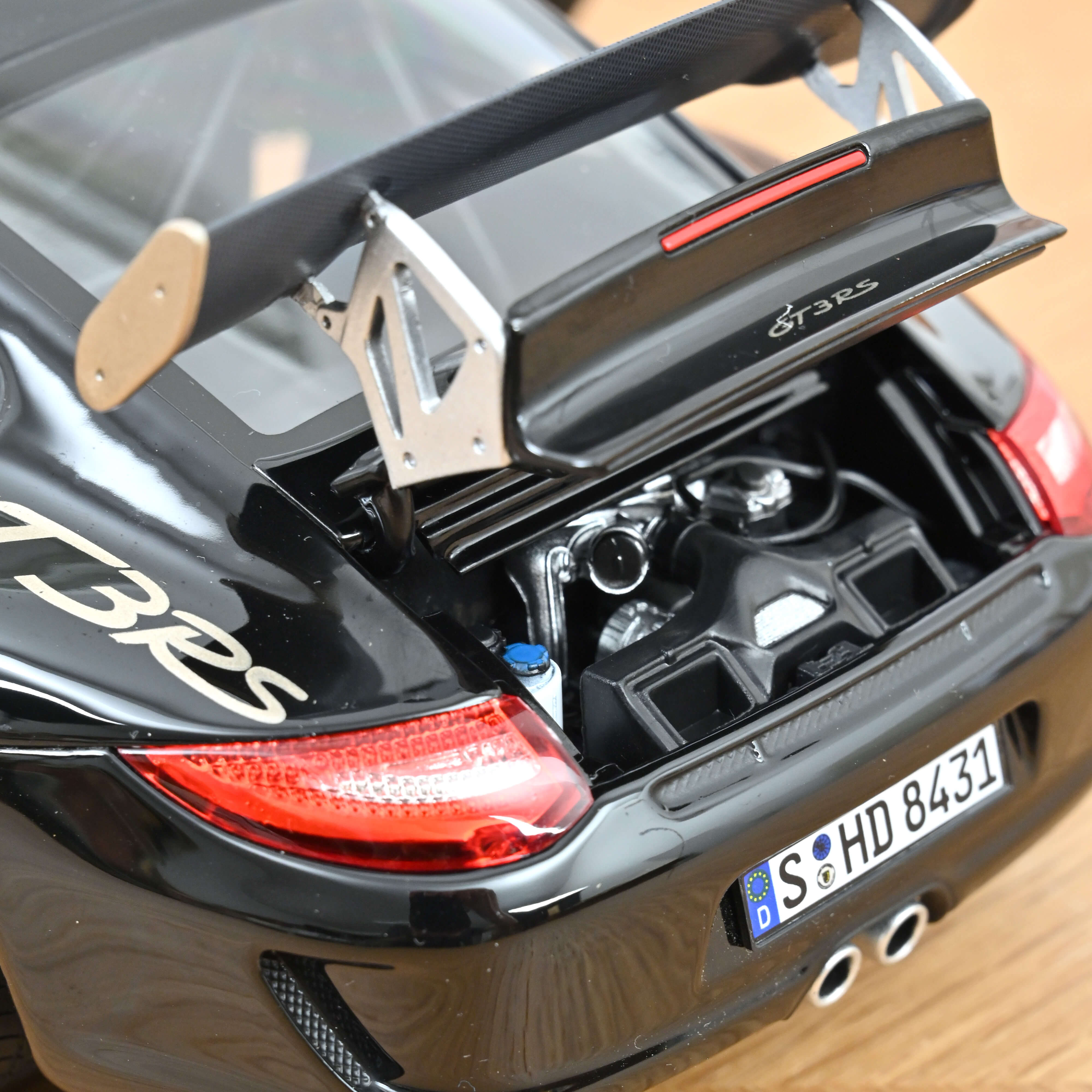 The Porsche 997 GT3 RS is the second generation of the GT3 RS. Like its predecessor, it served as a homologation model for the RSR racing car, which was used in the GT2 class of the FIA GT Championship. Even without the extreme aerodynamics of the current model, the 911 GT3 RS from the 997 series exudes sporty elegance, which is further emphasised by its paintwork. Our 1/18 scale model impresses with its perfect proportions and four opening parts.