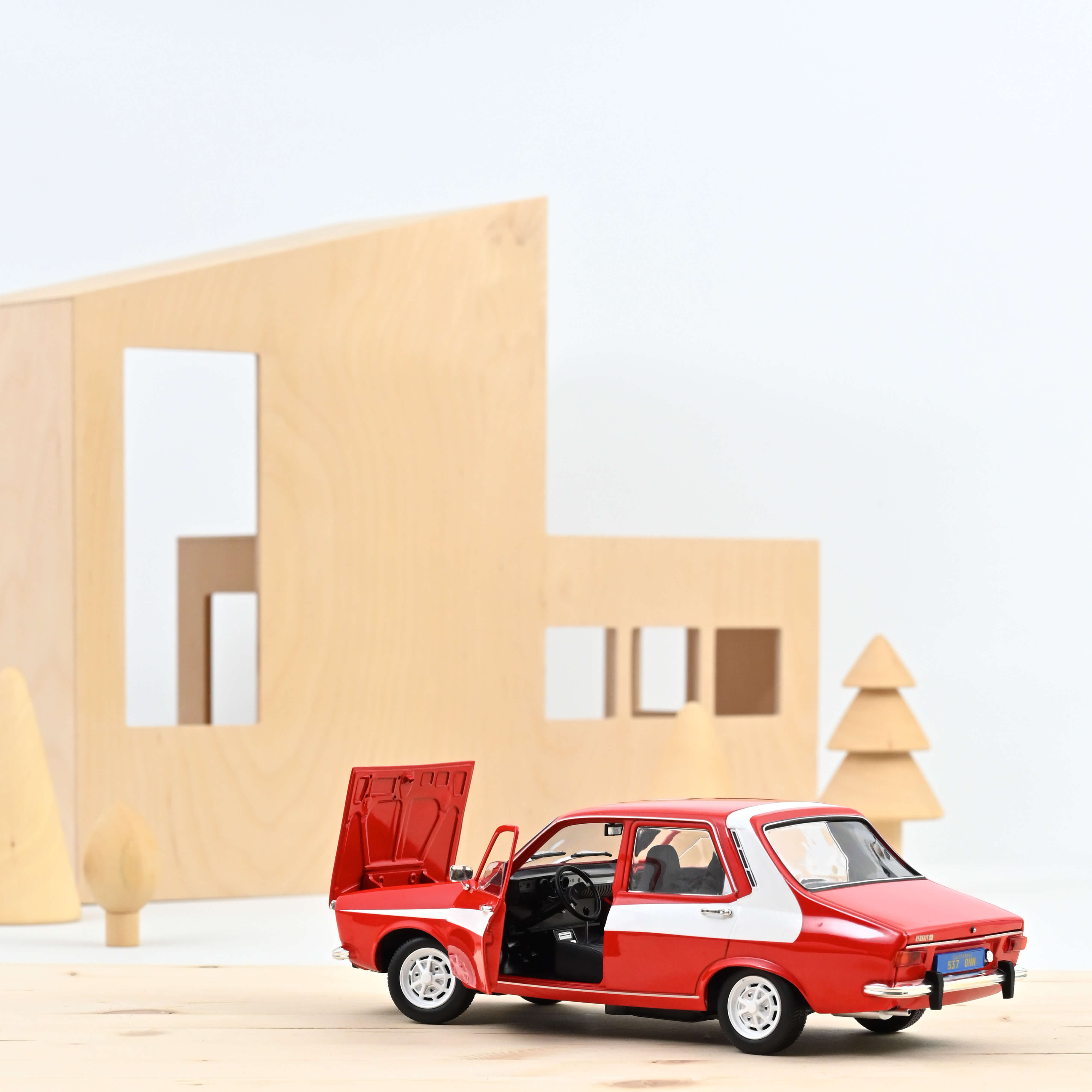 This version of the Renault 12 pays tribute to the numerous owners of red Renault 12s who wished to have a car in the spirit of "Starsky and Hutch" by adding white side stripes. Features include openings for the hood (with visible engine) and the two front doors.