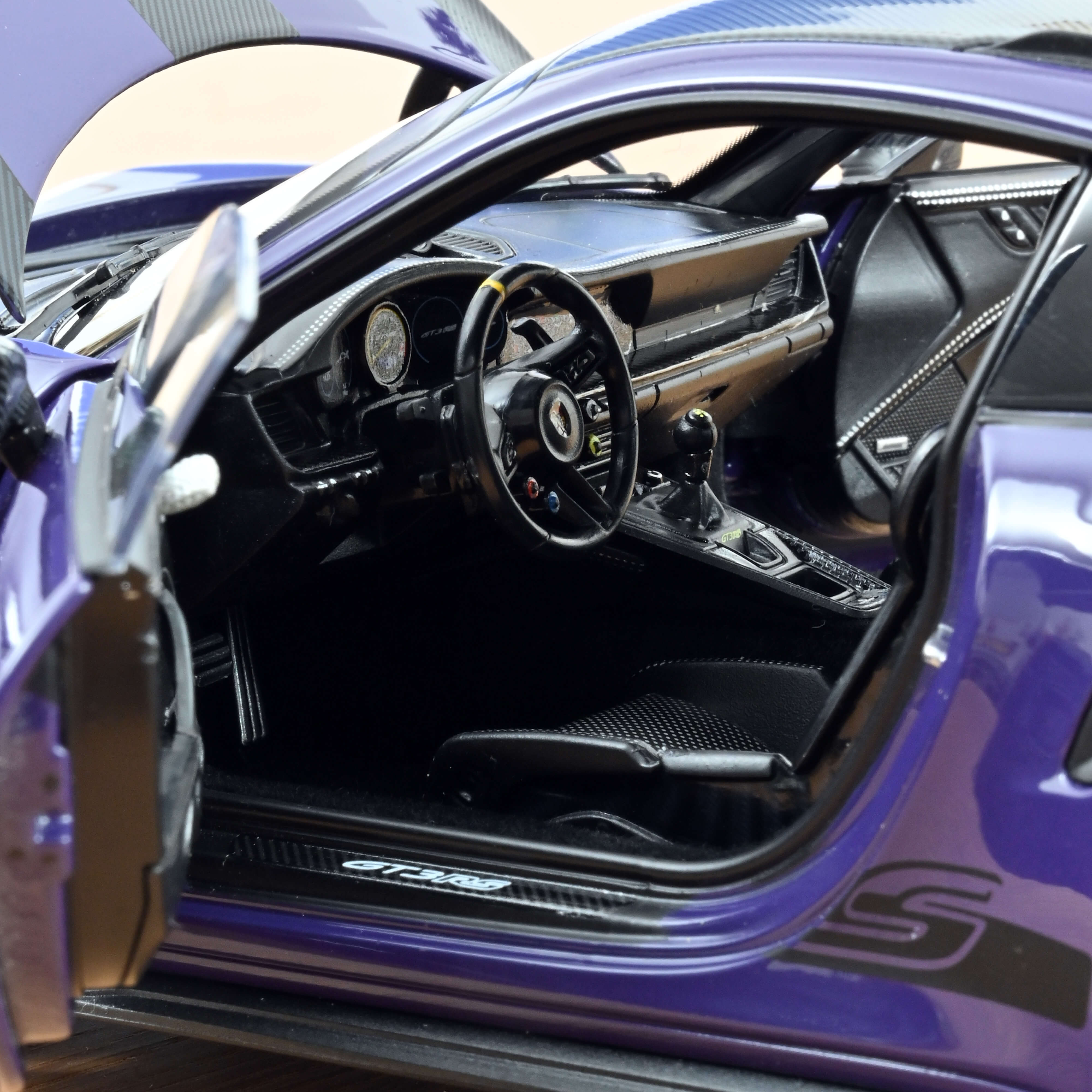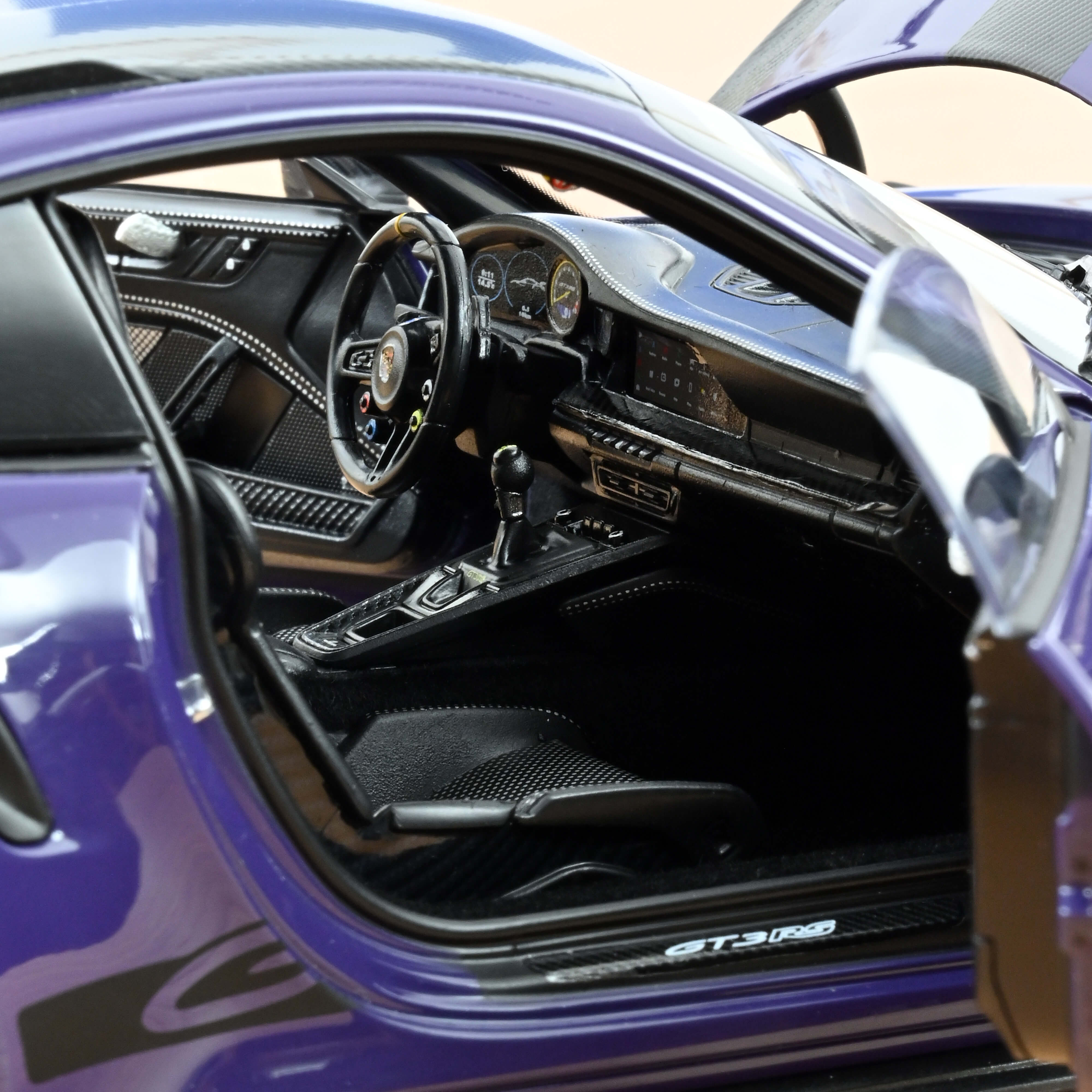 The Paint to Sample option offers the opportunity for customers to choose from a wide selection of classic Porsche colours when configuring their new Porsche. These colours include Ultraviolet, which in combination with the black rims gives the spectacular GT3 RS a particularly sporty look. Like all previously released versions, this one also impresses with a detailed interior, opening doors, bonnet and numerous photo-etched grilles.
