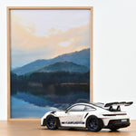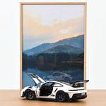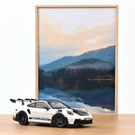 Our highly detailed Porsche 911 GT3 RS in 1/18 scale impresses with its excellent finish and attention to detail. The opening parts include doors and boot lid, which allow a view of the finely crafted interior and the detailed boot with cooling air ducts. Particularly noteworthy are the grilles made from photo-etched parts, which give the model a realistic look. The white paintwork with accents and rims in indigo blue round off the elegant and sporty appearance.