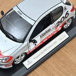 To celebrate the world championship titles of the 206 WRC in 2000, 2001, and 2002, Peugeot created a special edition of the 206 RC for the German market, complete with the iconic WRC advertising decor. Norev honours this version with a 1/18 scale model featuring four openable parts, faithfully reproducing the original grey colour and WRC decoration details. Limited to 206 pieces, this edition is a must-have for rally and miniature enthusiasts, with precise finishes that pay homage to Peugeot's sporting legacy.