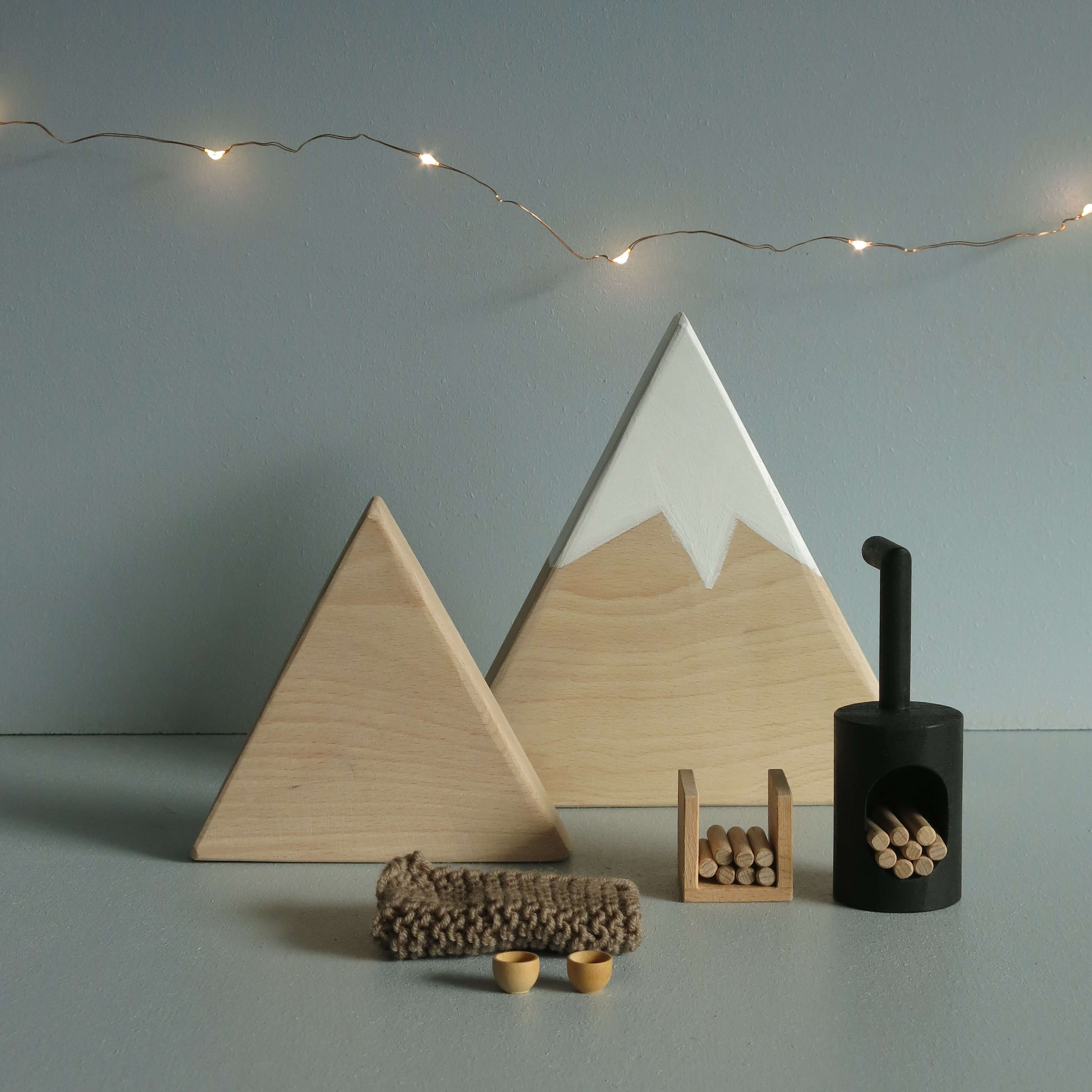 We're two little mountains in solid beech. We're as much a decorative object as a backdrop for the world of rabbits. We conjure up an atmosphere of wide open spaces, wild nature and summits to climb. Let's get going!