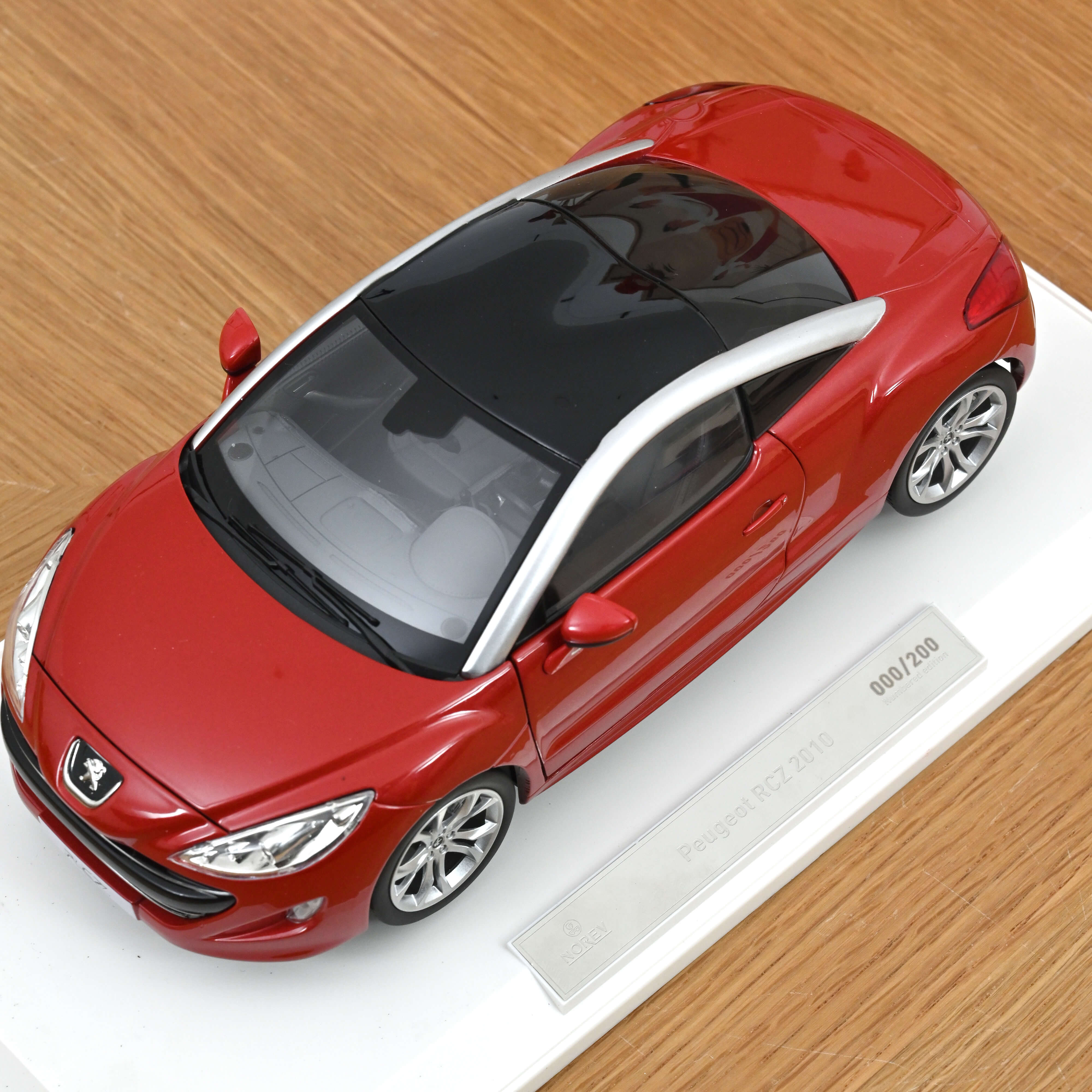 Launched in 2010, the Peugeot RCZ is a bold 2+2 coupé almost identical to the original 308 RC Z concept. Featuring aluminium roof arches and the distinctive double-bubble rear window inspired by Zagato, it marked a strong design statement for Peugeot. A true modern sports car embodying the RC spirit. Norev recreates it in 1:18 Amber Red with three opening parts and a finely detailed engine and interior.