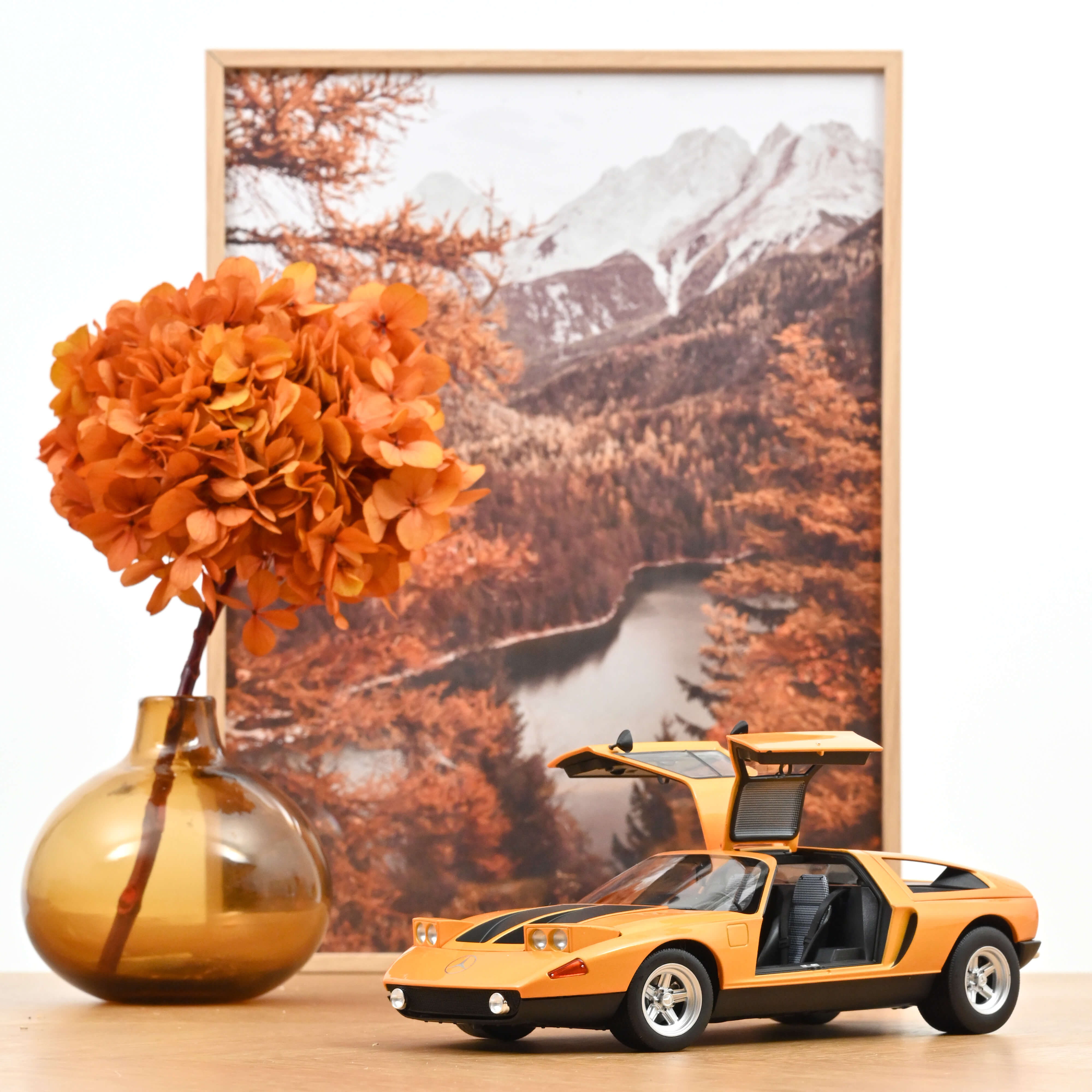 Experience the C111-II in miniature – discover details such as the Wankel engine, the elaborate rear axle, the special interior with instruments behind glass, the gullwing doors with pull tabs, and the radiator under the front bonnet. And find out that ‘White autumn’ can indeed be the name for an orange metallic colour.