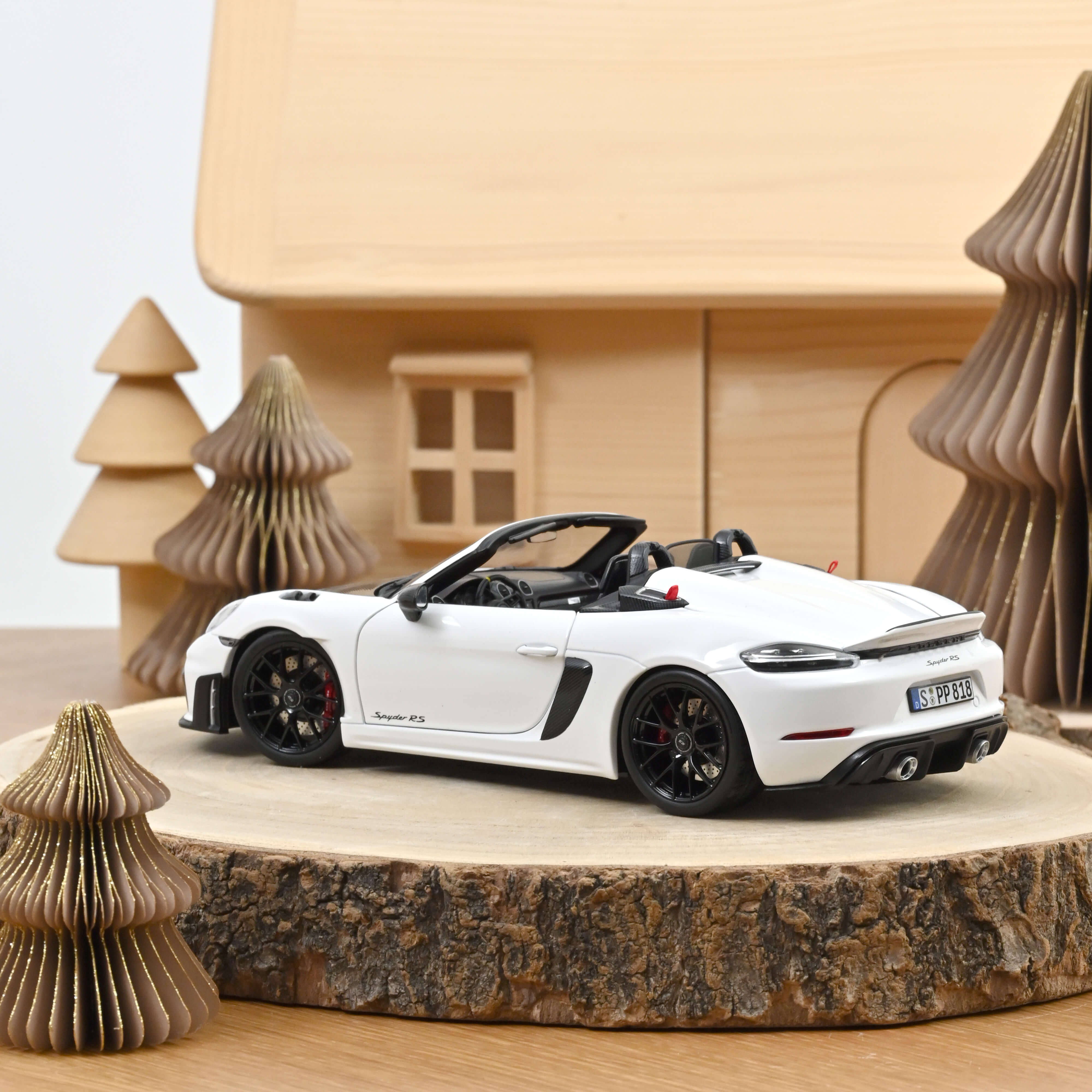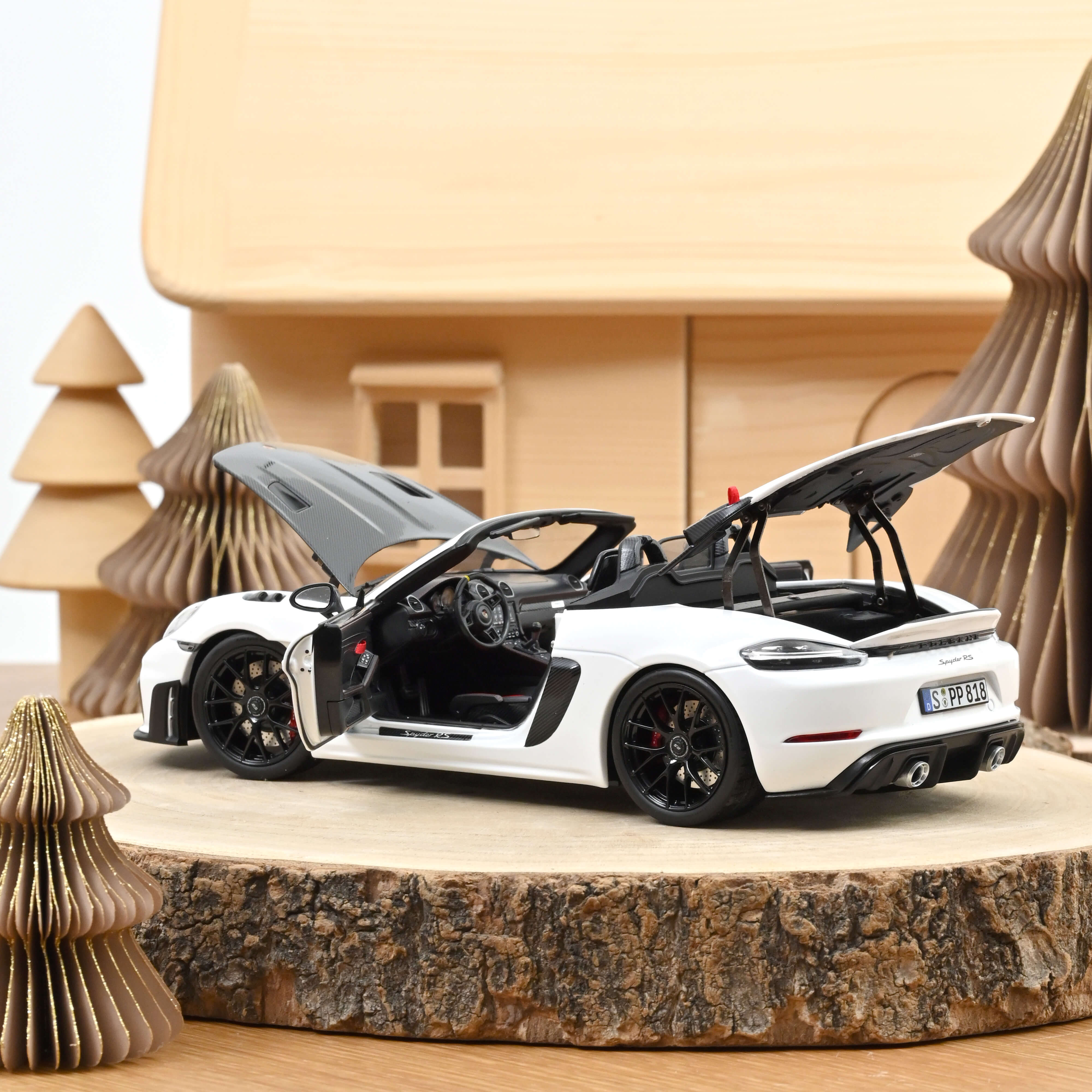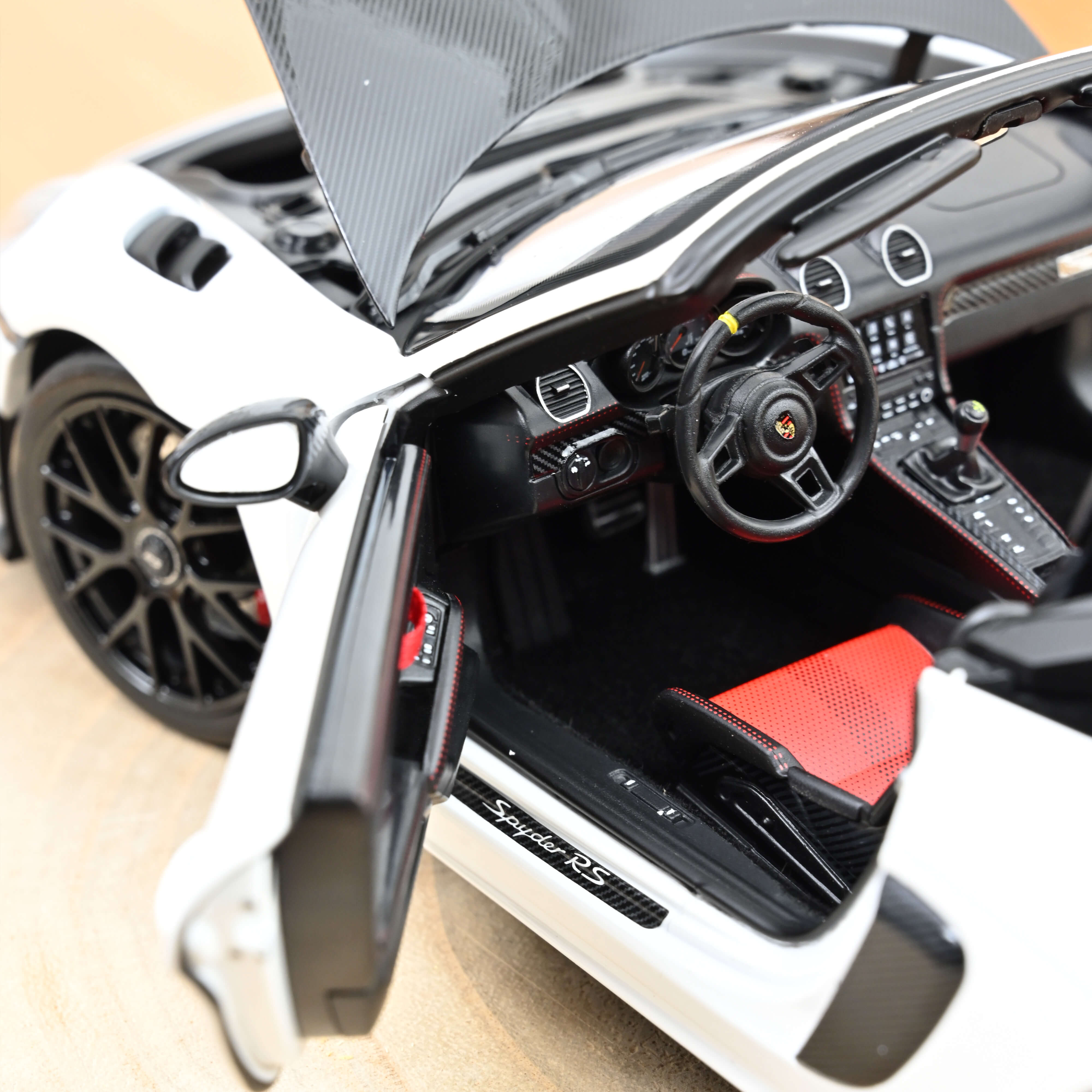 Our model precisely replicates the original in every detail - from the perfectly proportioned body to the rims, tyres, etched brake discs, the interior and the filigree, photo-etched grilles. A particular highlight is the complex kinematics of the boot lid, which is in every aspect accurate to the real vehicle. Our 718 Spyder RS in white comes with the optional Weissach package, whose numerous visible carbon fibre parts give the model a particularly sporty touch. Only 102 pieces of this special edition for the Asian market have made their way to our shop – so be quick and secure your copy!