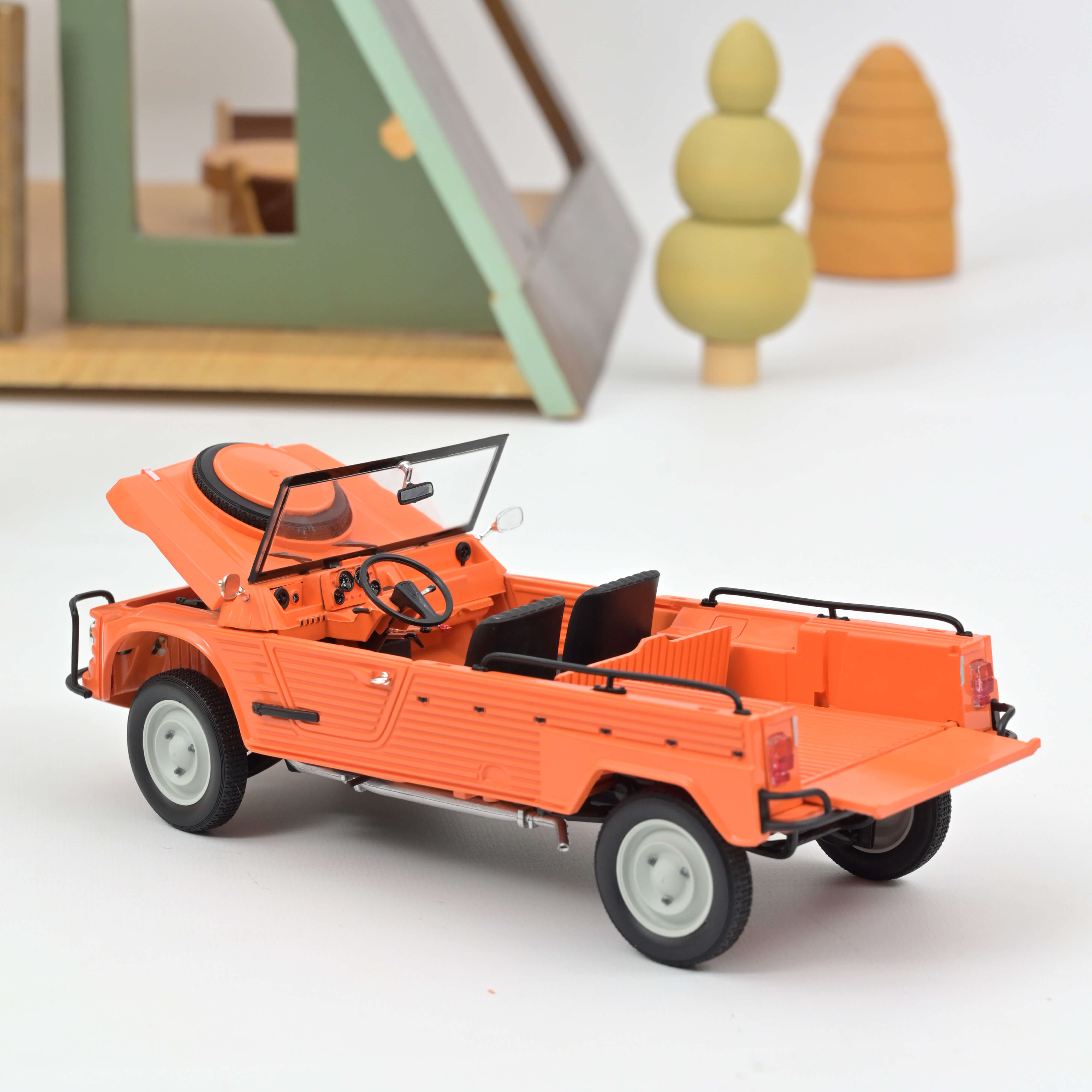 C'est la Méhari 4x4 2e version avec bas de caisse rabotés (AM1982 07/1981). Le capot s'ouvre indépendamment de la roue de secours qui pivote sur son propre support. La planche de bord est munie du combiné spécifique 4x4 avec ses 4 cadrans ronds sans oublier les 3 leviers (Vitesses, 4x4/4x2, Réducteur). Le levier de blocage du différentiel AR est présent entre les sièges. Le train AR avec différentiel et cardans est bien reproduit mais perd les suspensions fonctionnelles de la 4x2. Portes fixes.