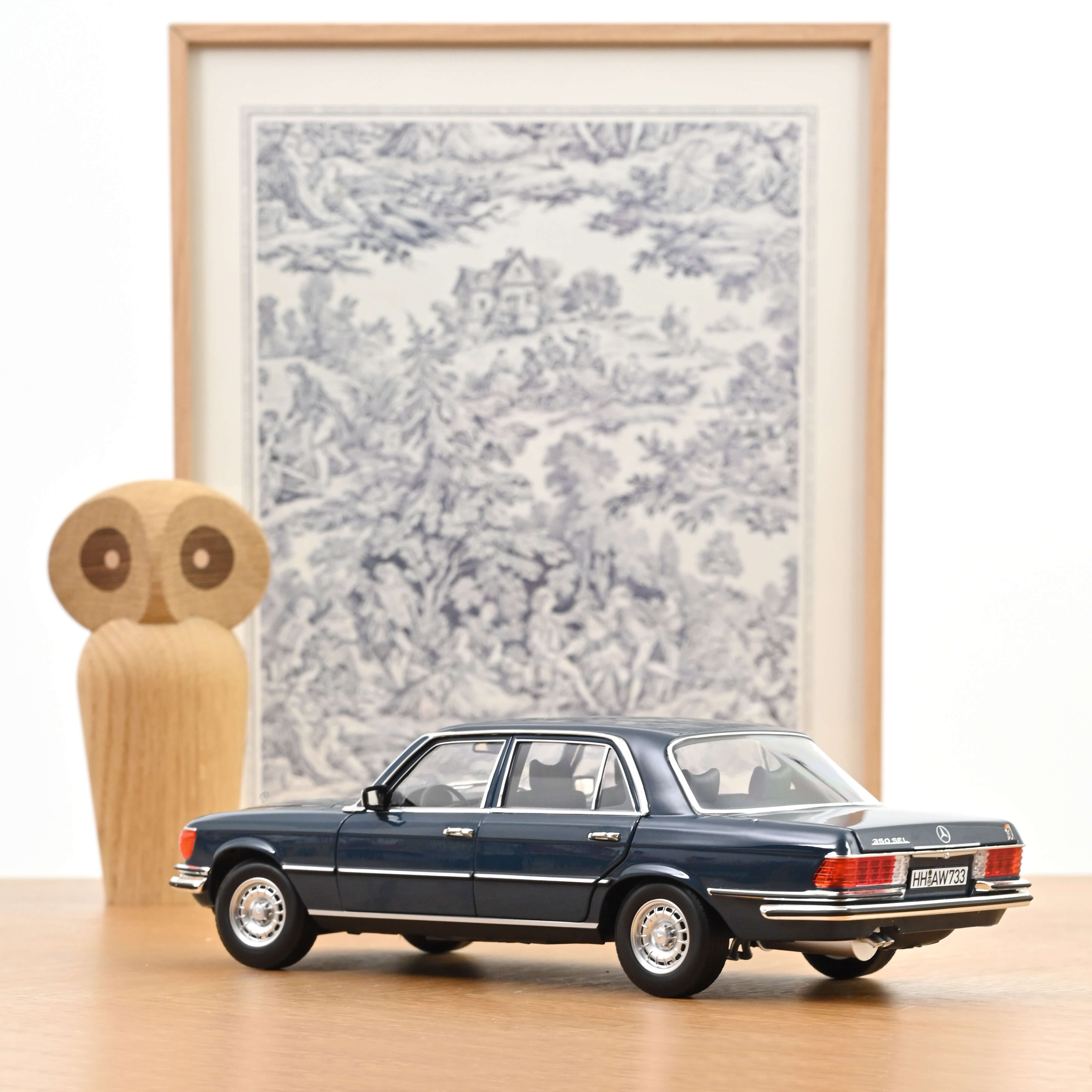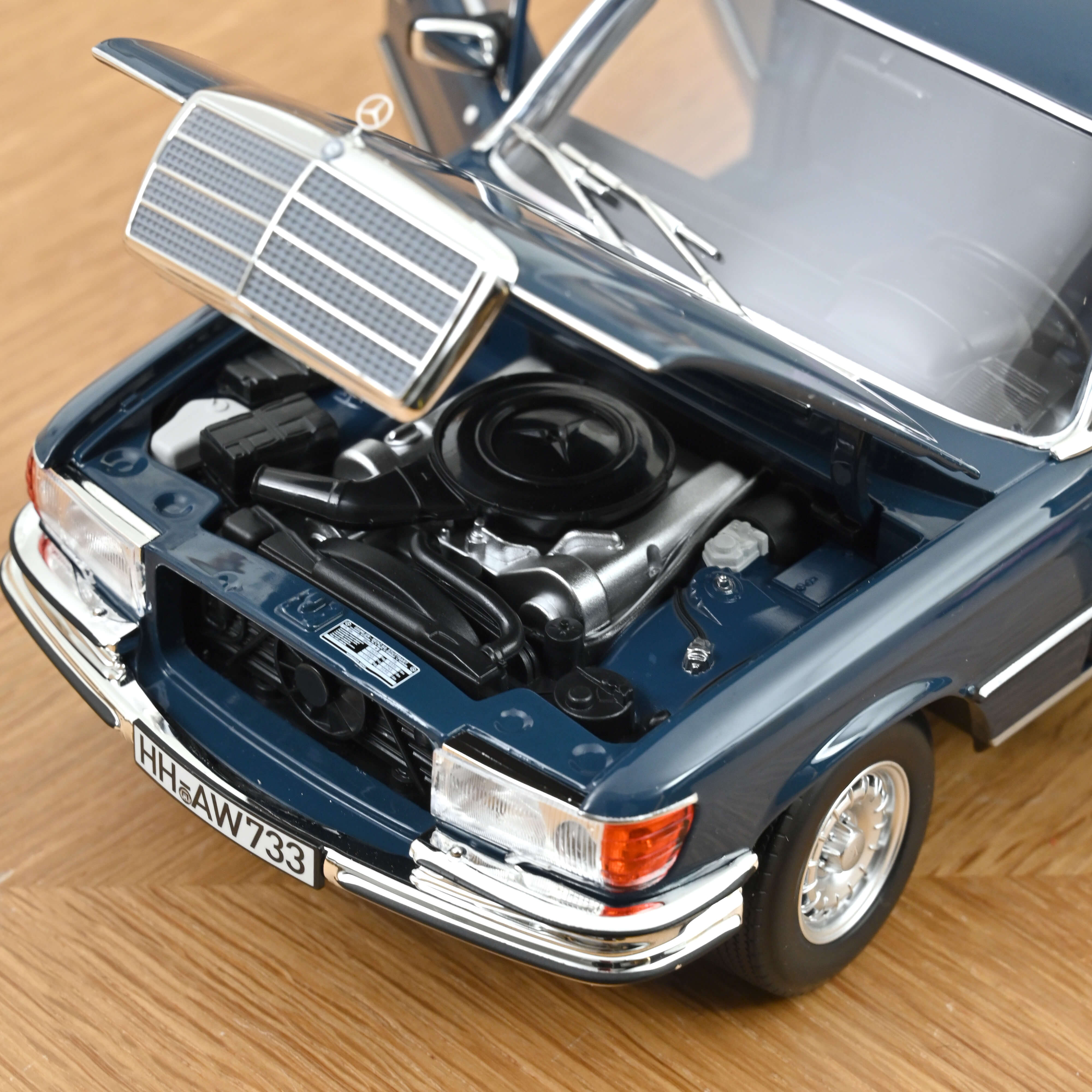 La 350 SEL était l'une des motorisations les plus demandées de la série Mercedes. Le bleu Hansa (code 940) faisait partie des couleurs discrètes de l'époque et, associé à l'intérieur noir, le modèle original de notre maquette devait rester plutôt discret.