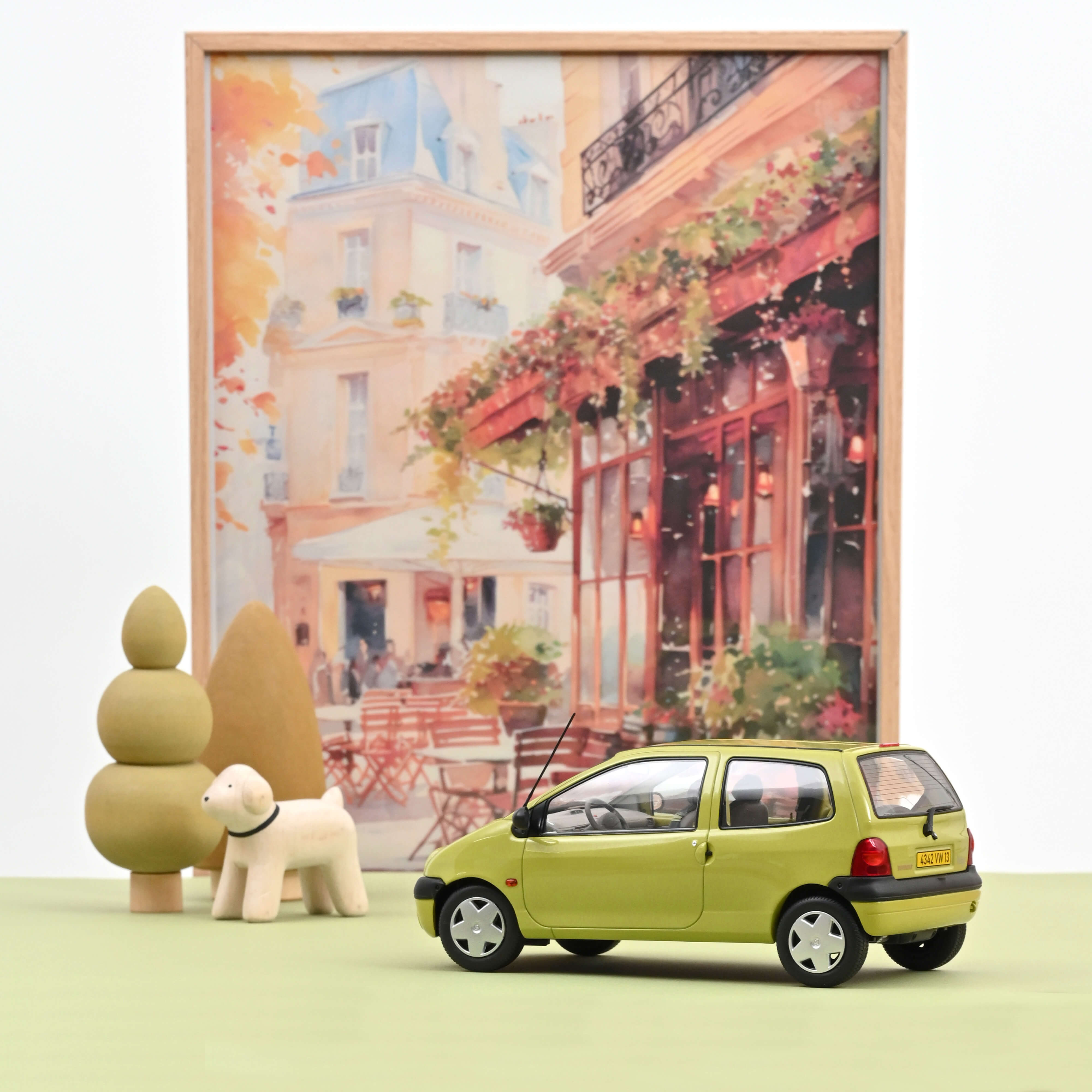 La Renault Twingo I restylée en 1998 modernise la citadine iconique : phares monobloc, boucliers lissés peints, nouveaux enjoliveurs et antibrouillards ronds. L’habitacle évolue avec tableau de bord redessiné, airbag passager et commandes jaunes. En teinte Anis Yellow avec sellerie Lucy, elle symbolise l’esprit coloré des années 1990. Norev la reproduit au 1/18 sans ouvrants, avec intérieur fidèlement détaillé.